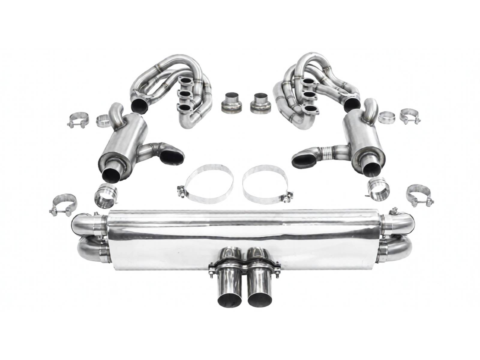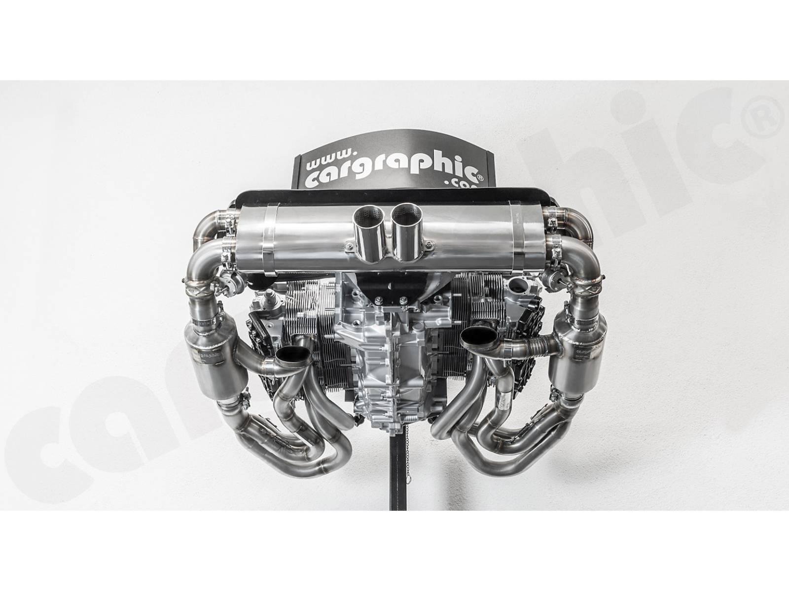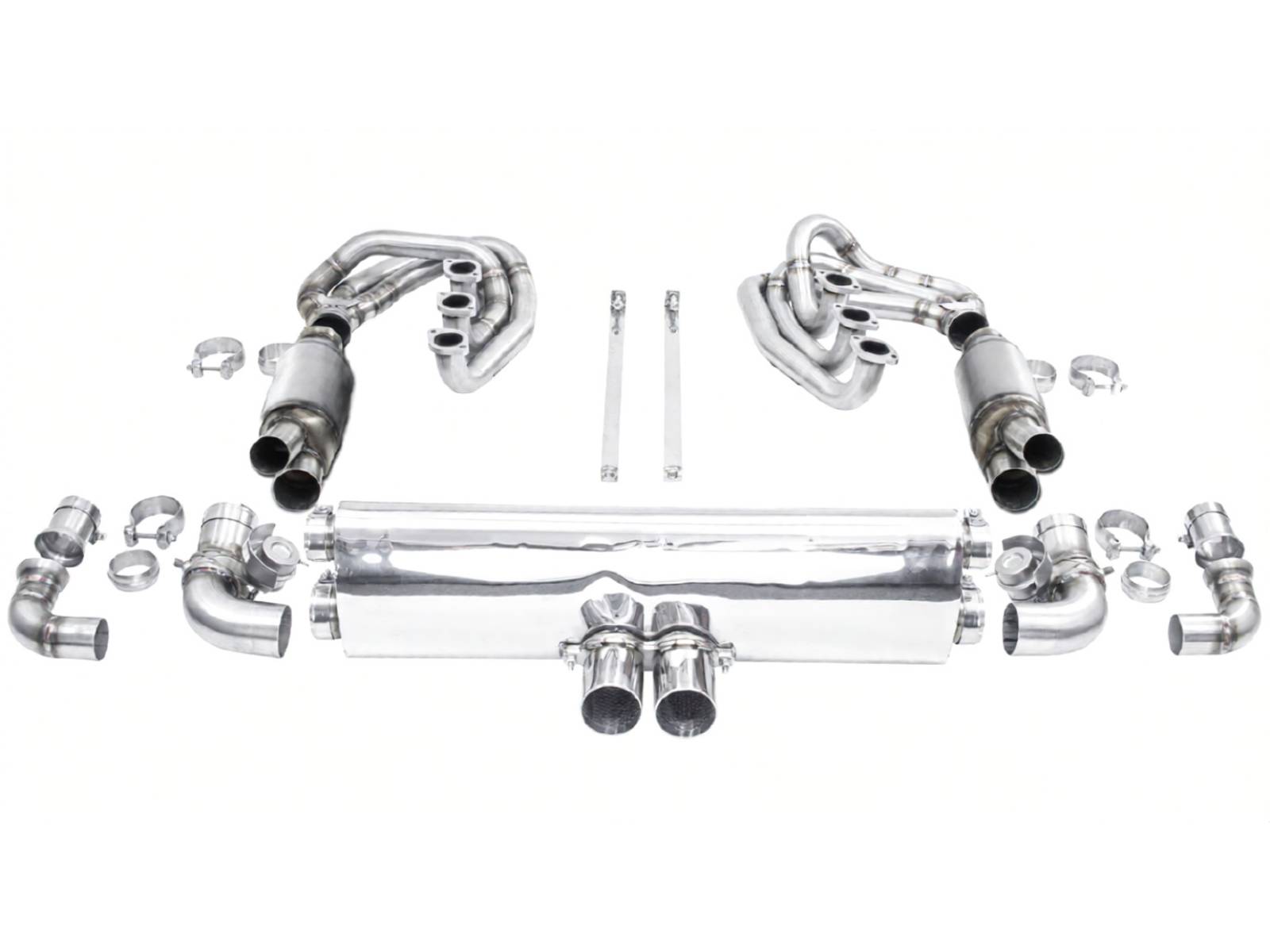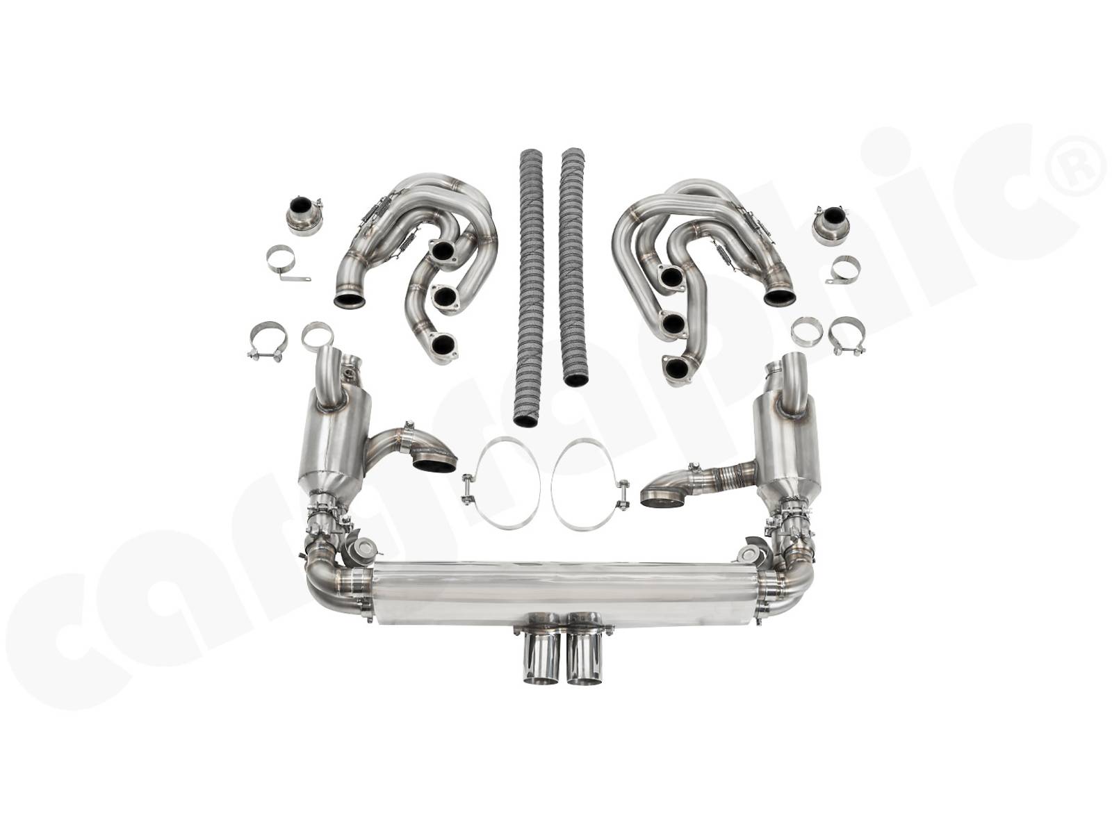 CARGRAPHIC GT Sportauspuffanlage (Rückversion) mit ID45 GT Krümmer, mit/ohne 2x200cpsi Katalysatoren, mit Heizung , Auslassklappen und 4-2-Endschalldämpfer mit mittigem Auslass (2x70 mm GT3-Optik).