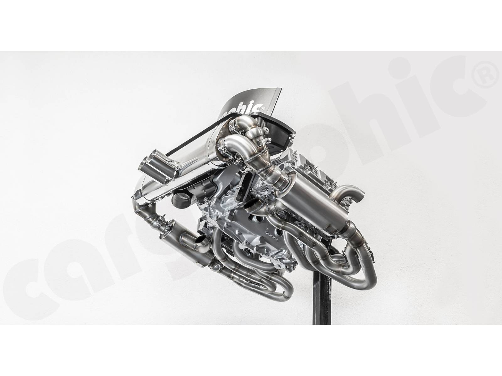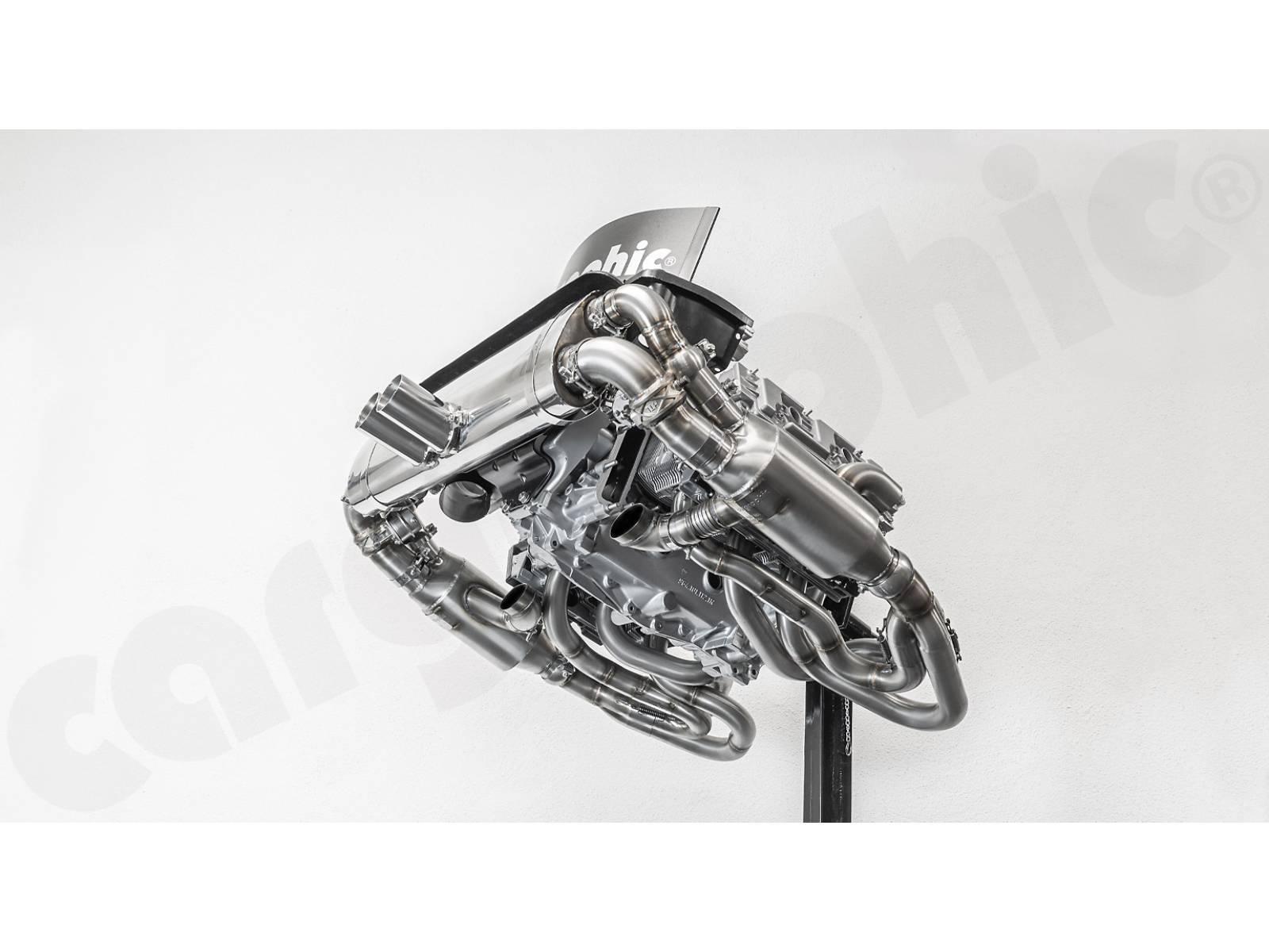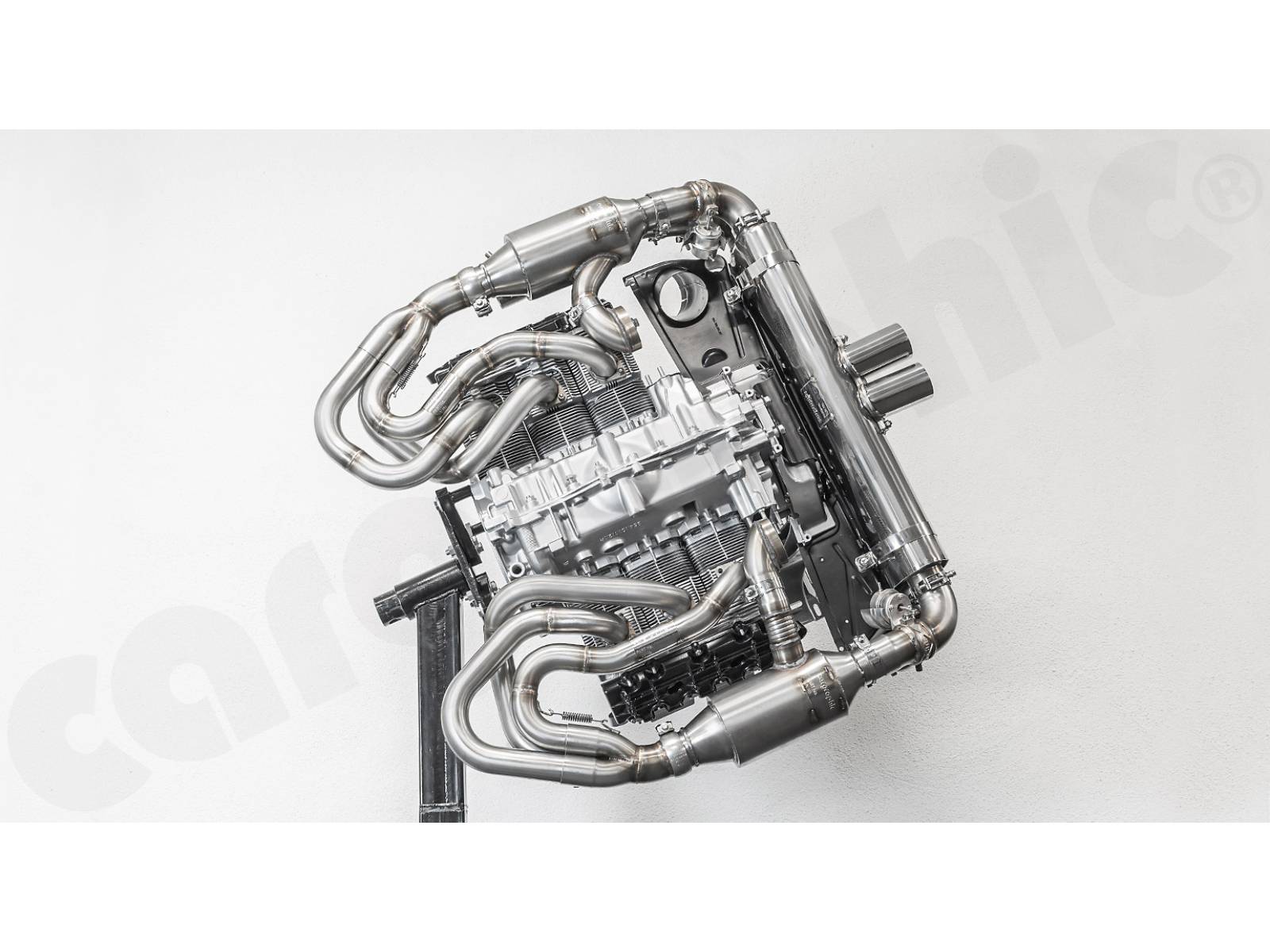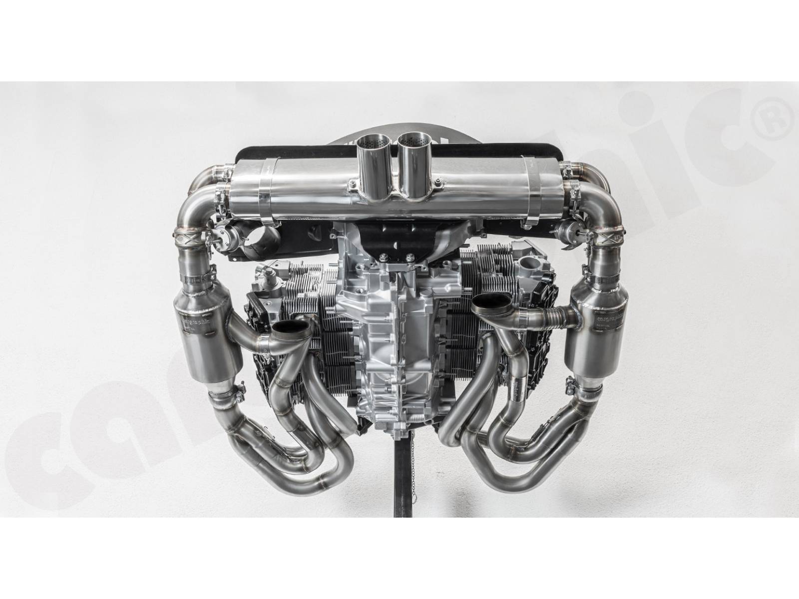 CARGRAPHIC GT Sportauspuffanlage (Rückversion) mit ID45 GT Krümmer, mit/ohne 2x200cpsi Katalysatoren, mit Heizung , Auslassklappen und 4-2-Endschalldämpfer mit mittigem Auslass (2x70 mm GT3-Optik).