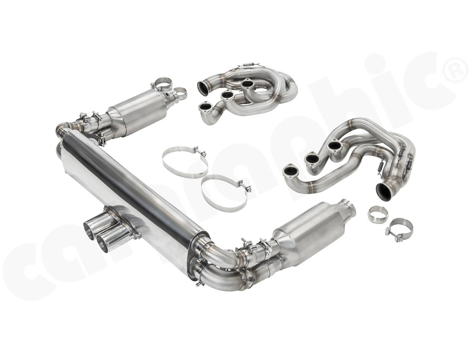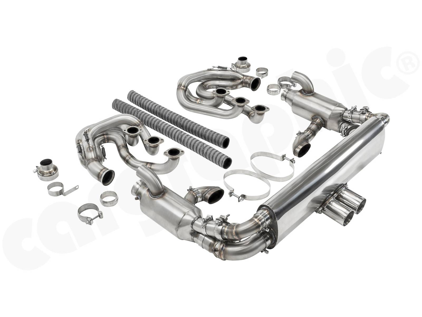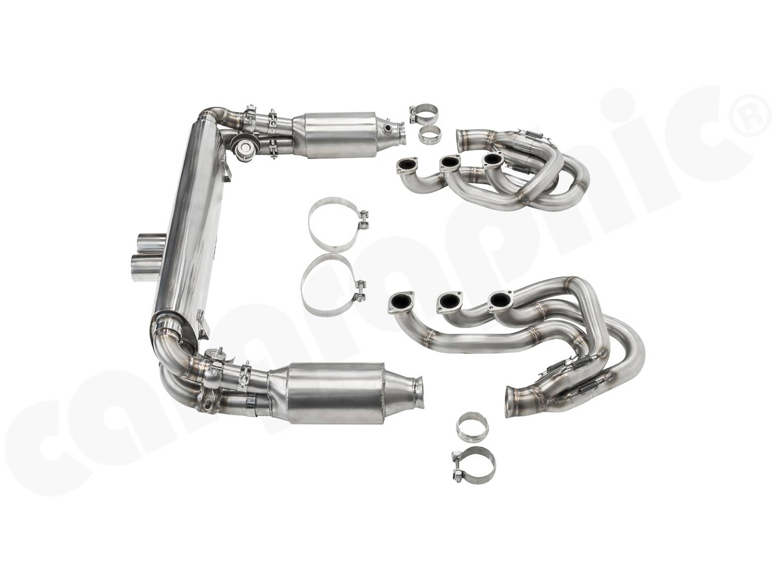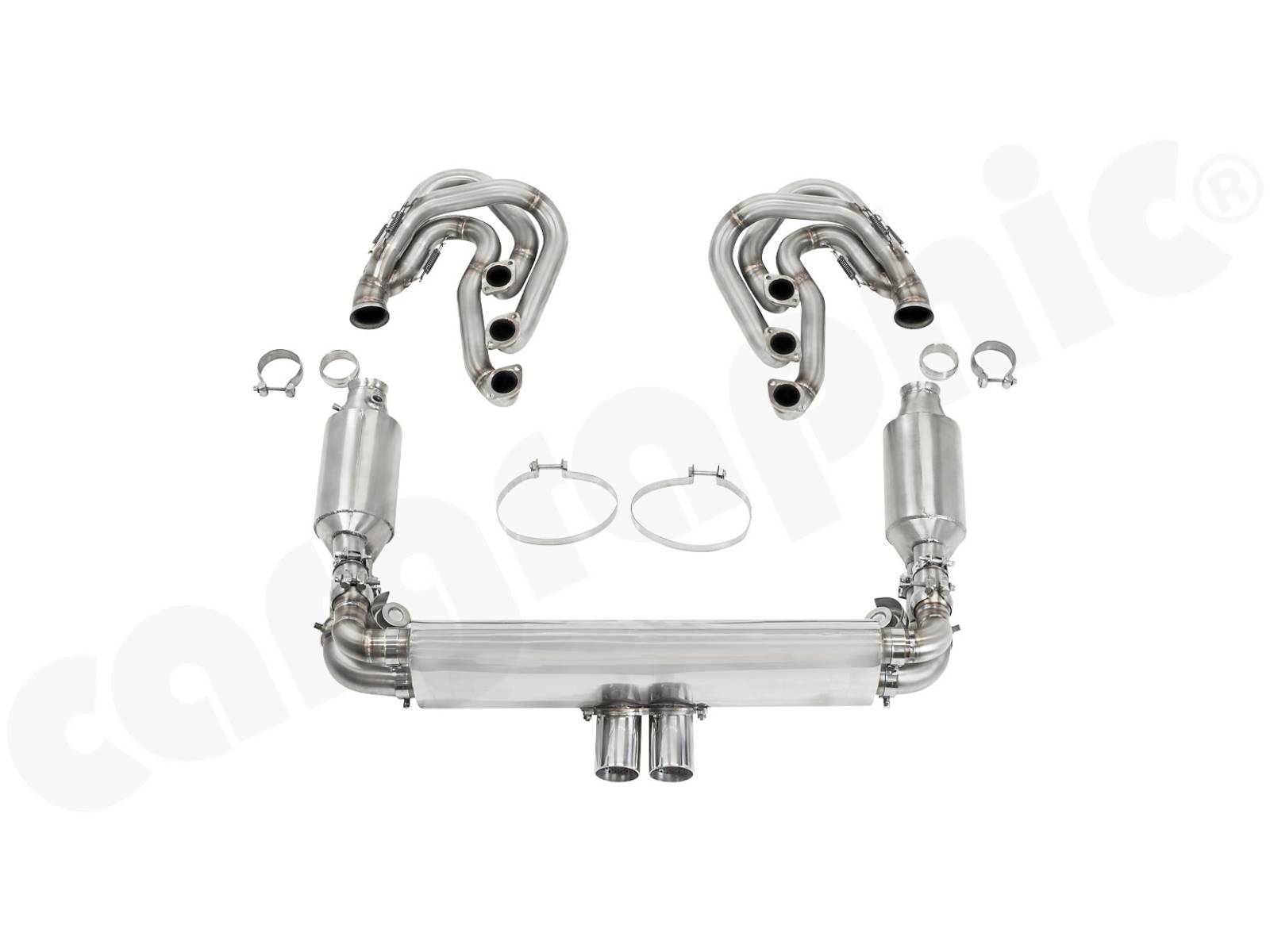 CARGRAPHIC GT Sportauspuffanlage (Backdate) mit ID42 GT Krümmer, mit/ohne 2x100cpsi MS Katalysatoren und 4>2 Flow Endschalldämpfer mit mittigem Auslass (2x70mm GT3-Optik). System ohne Heizung.