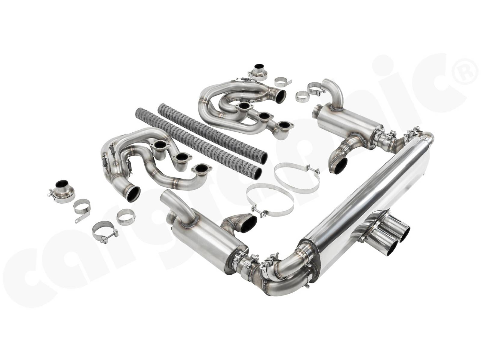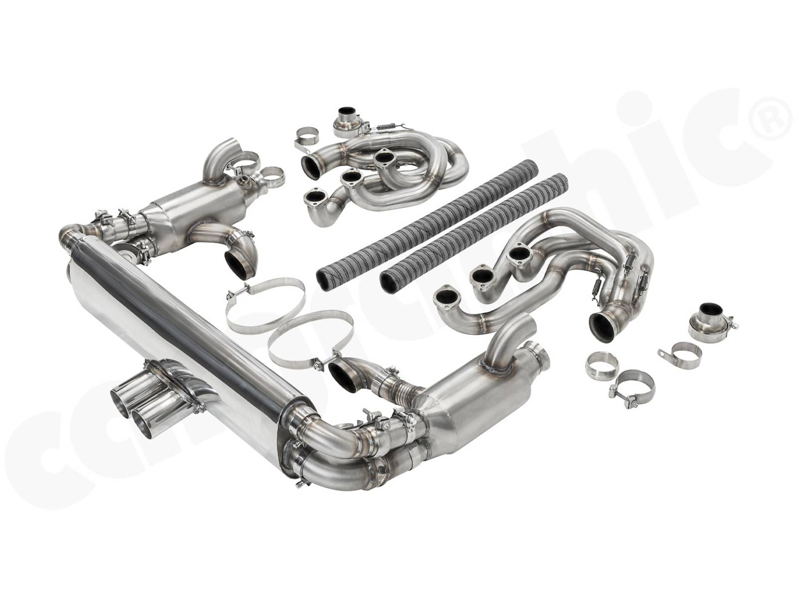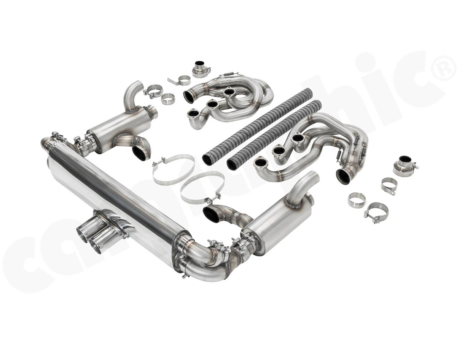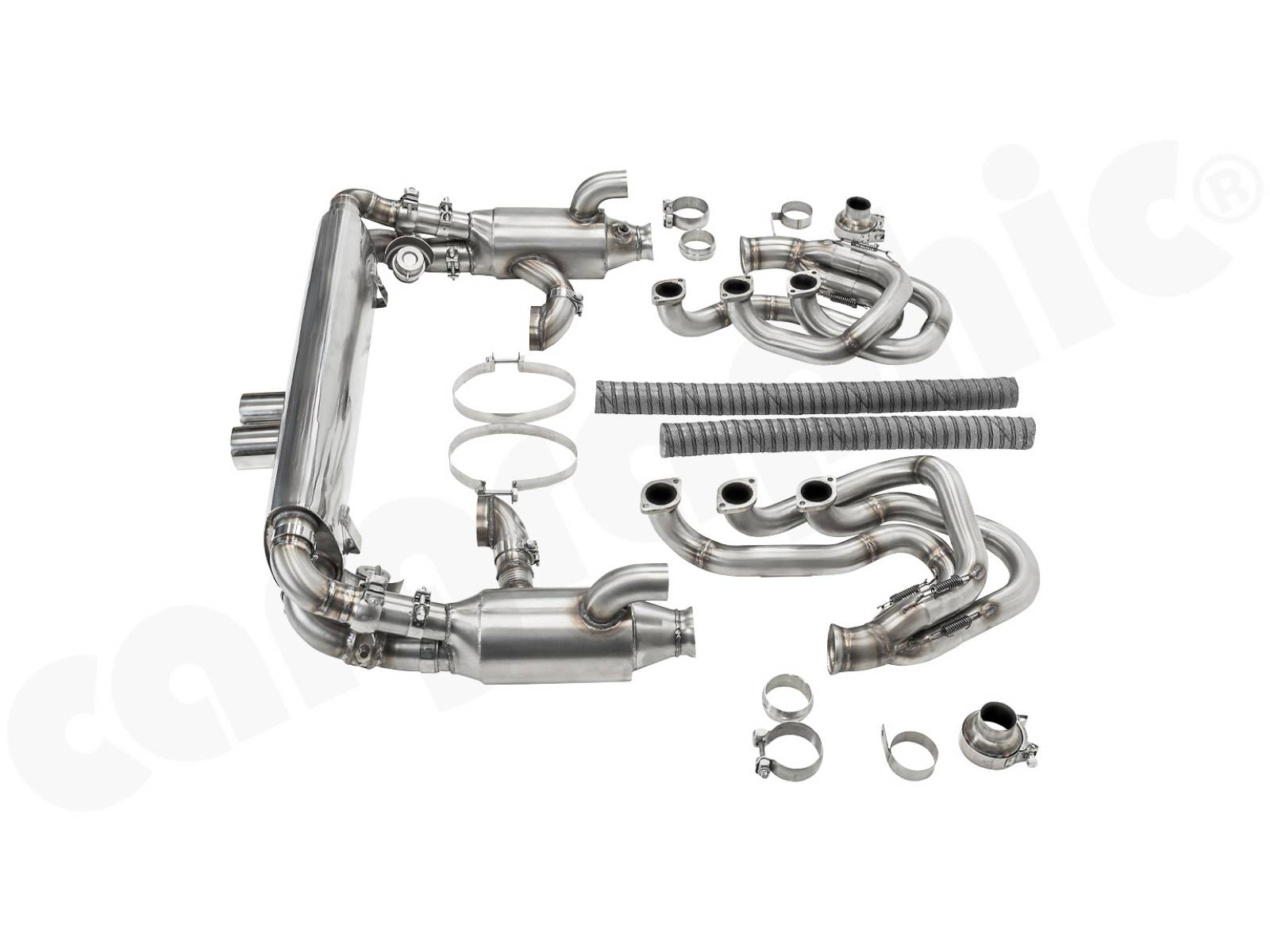 CARGRAPHIC GT Sportauspuffanlage (Backdate) mit ID42 GT Krümmer, mit/ohne 2x100cpsi MS Katalysatoren und 4>2 Flow Endschalldämpfer mit mittigem Auslass (2x70mm GT3-Optik). System ohne Heizung.