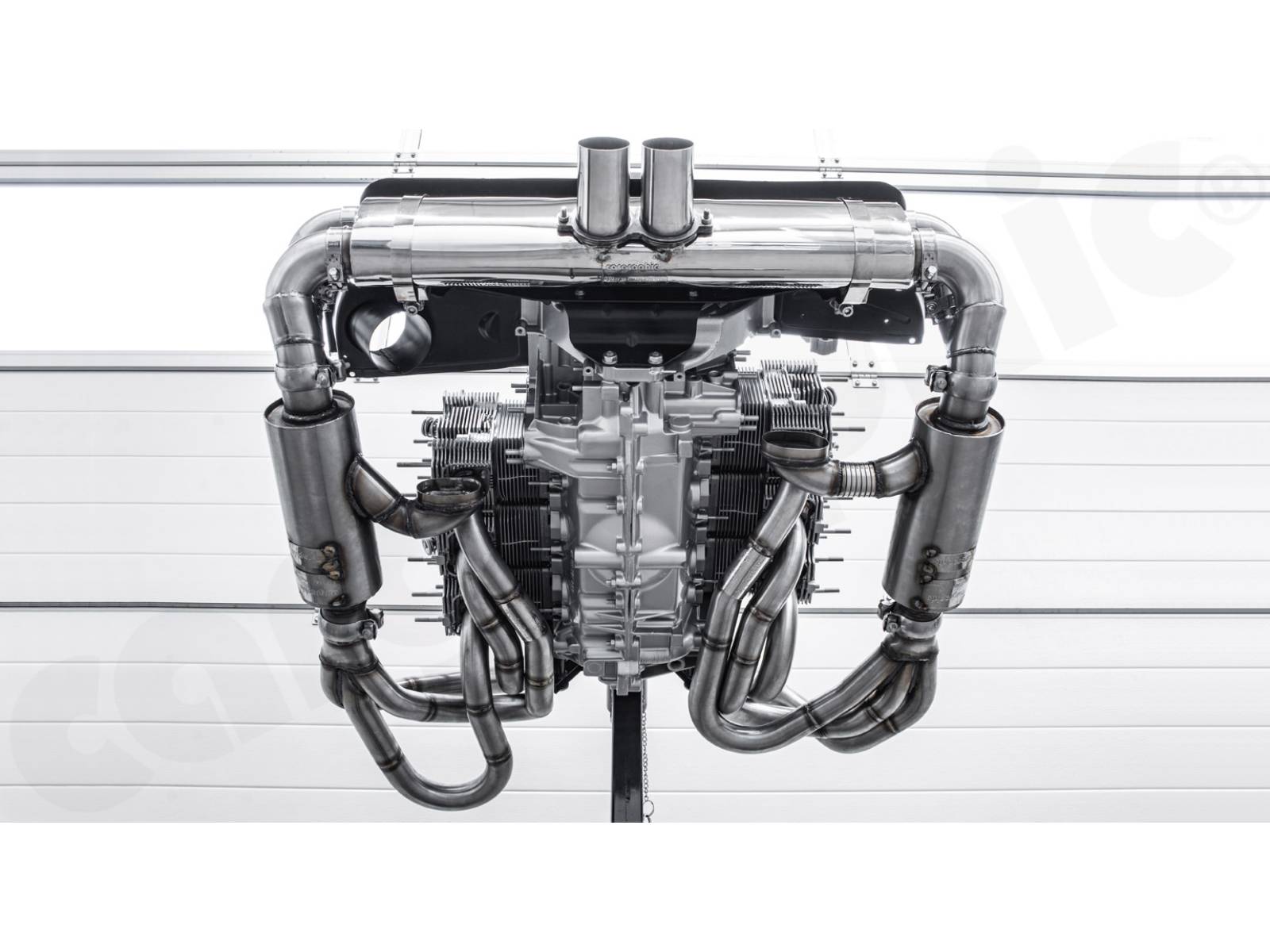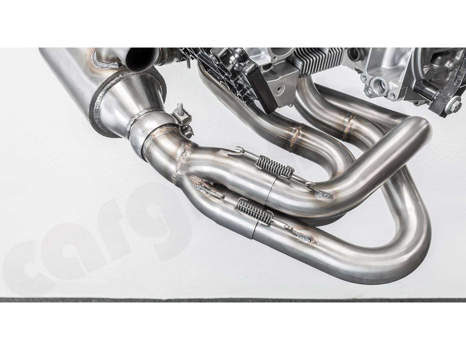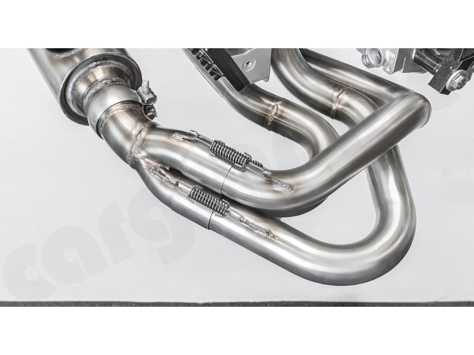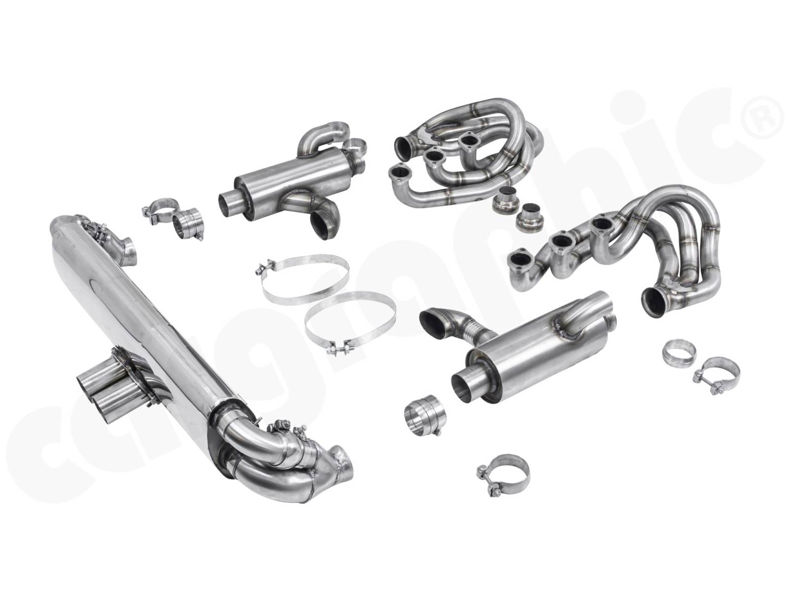 CARGRAPHIC GT Sportauspuffanlage (Backdate) mit ID42 GT Krümmer, mit/ohne 2x100cpsi MS Katalysatoren und 4>2 Flow Endschalldämpfer mit mittigem Auslass (2x70mm GT3-Optik). System ohne Heizung.