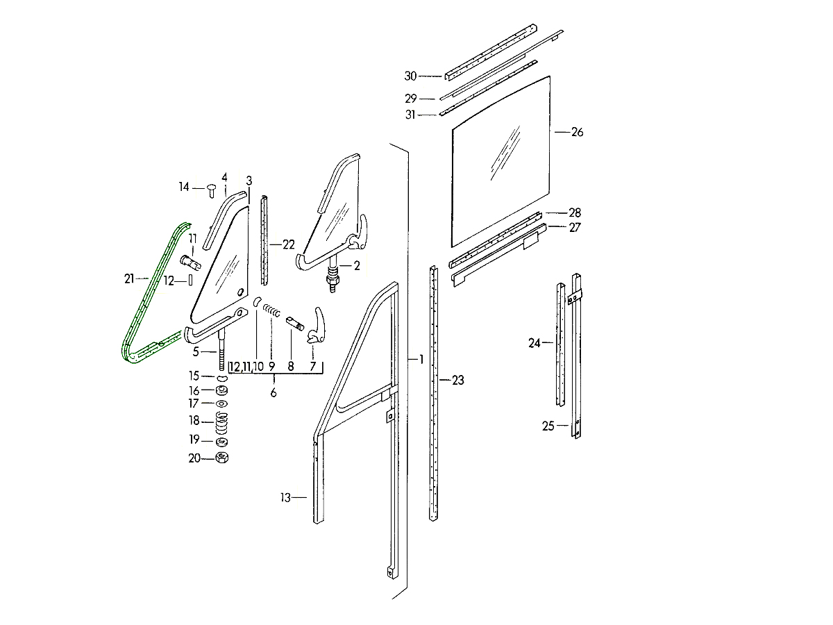 Marco de cristal de puerta / Ventana lateral / Cristal de ventana de puerta / Guía de ventana (Modelo: CABRIO, HARDTOP, COUPE, -KARMANN-, ROADSTER) 356B / 356C 1960-65 804-010