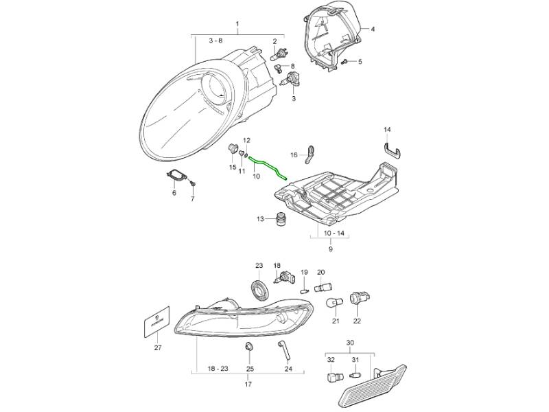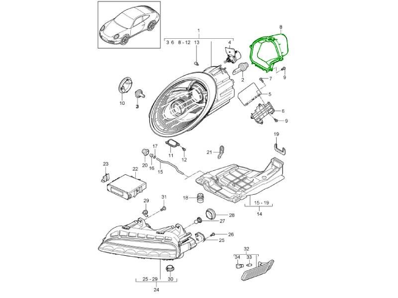 La cubierta trasera del faro Porsche es una pieza OEM original diseñada para proteger y sellar la parte trasera de la unidad del faro en los modelos Porsche 911 (997) equipados con faros de xenón y sistemas de haz direccional.