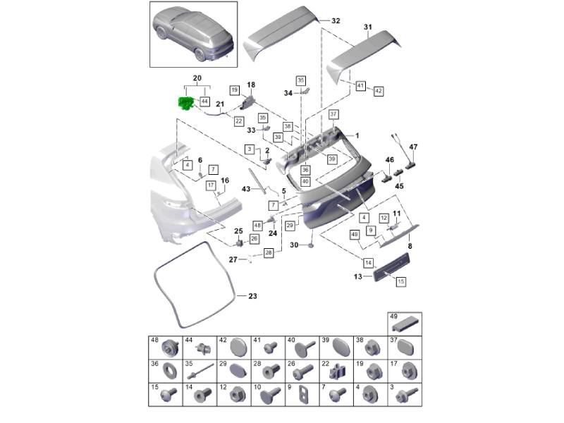 El cierre de la tapa trasera es un componente esencial del sistema de cierre del portón trasero del vehículo, diseñado para asegurar la tapa del maletero cuando está cerrada. Este mecanismo de cierre se acopla con el pestillo del portón trasero y el sistema de cierre centralizado para mantener el compartimento de equipaje cerrado de forma segura tanto en marcha como estacionado.