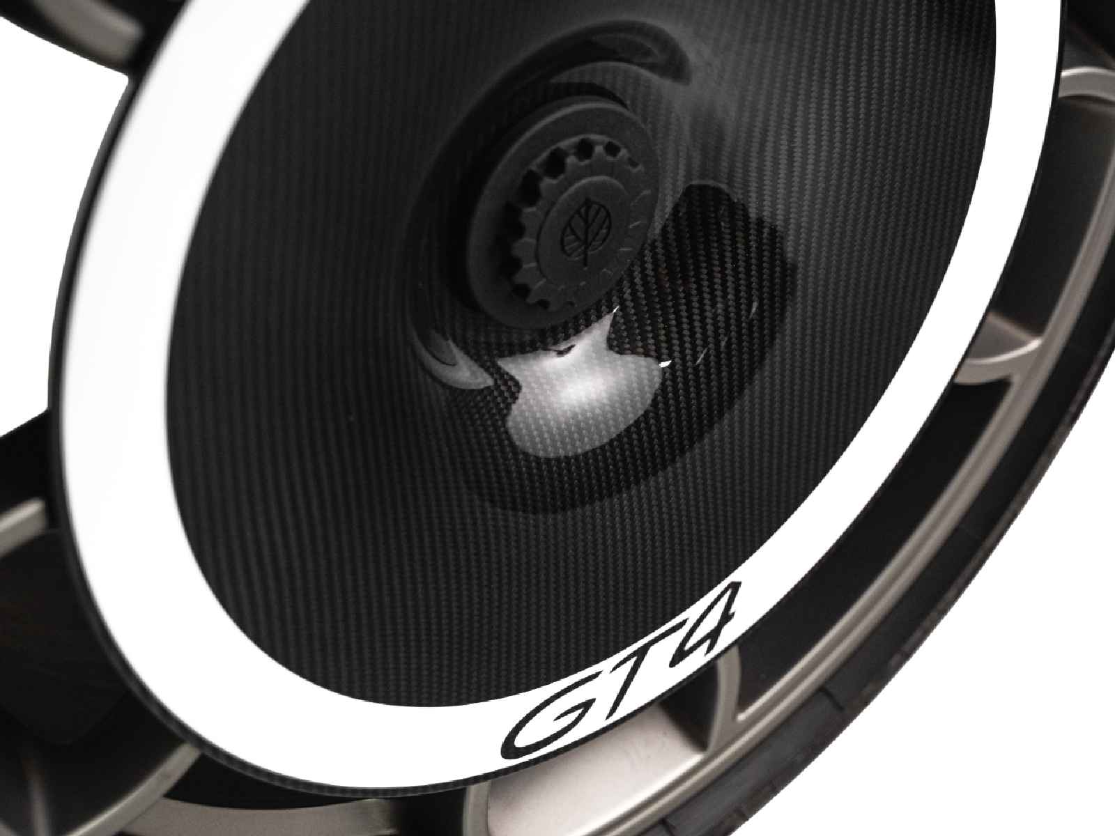 El diseño de las ruedas expuestas del GT4 genera resistencia aerodinámica y turbulencias en el flujo de aire. Estos discos aerodinámicos solucionan ese problema a la vez que le confieren una inconfundible estética de competición.