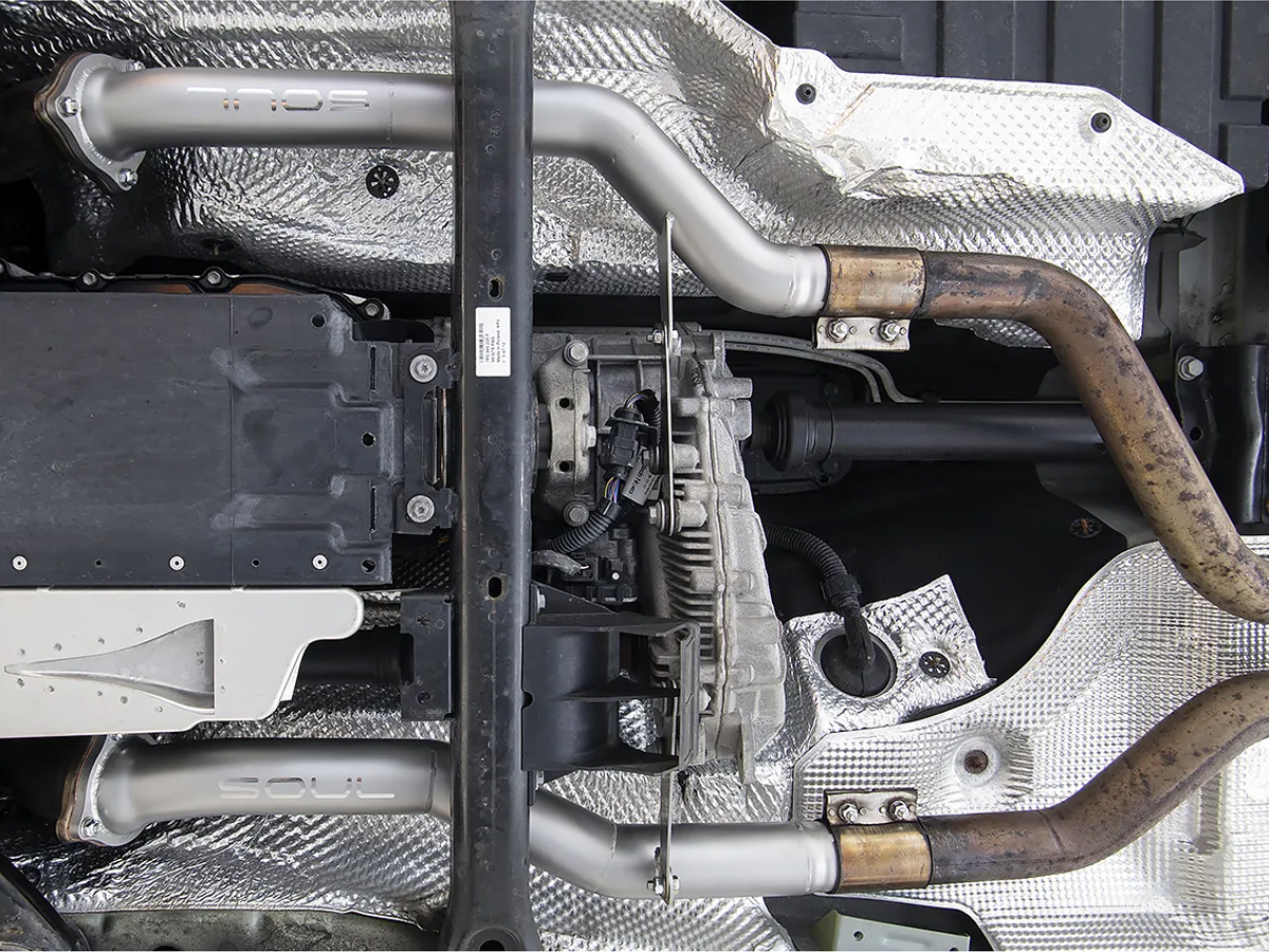 Chaque système est fabriqué à partir de tubes en acier inoxydable T304L cintrés au mandrin, comprenant des tubes robustes de 6,35 cm (2,5 pouces) sur l'essieu, et est associé à des silencieux renforcés pour une durabilité maximale. Les silencieux SOUL sont dotés d'un matériau insonorisant de qualité supérieure, conçu pour résister à une utilisation prolongée sans panne ni éclatement.