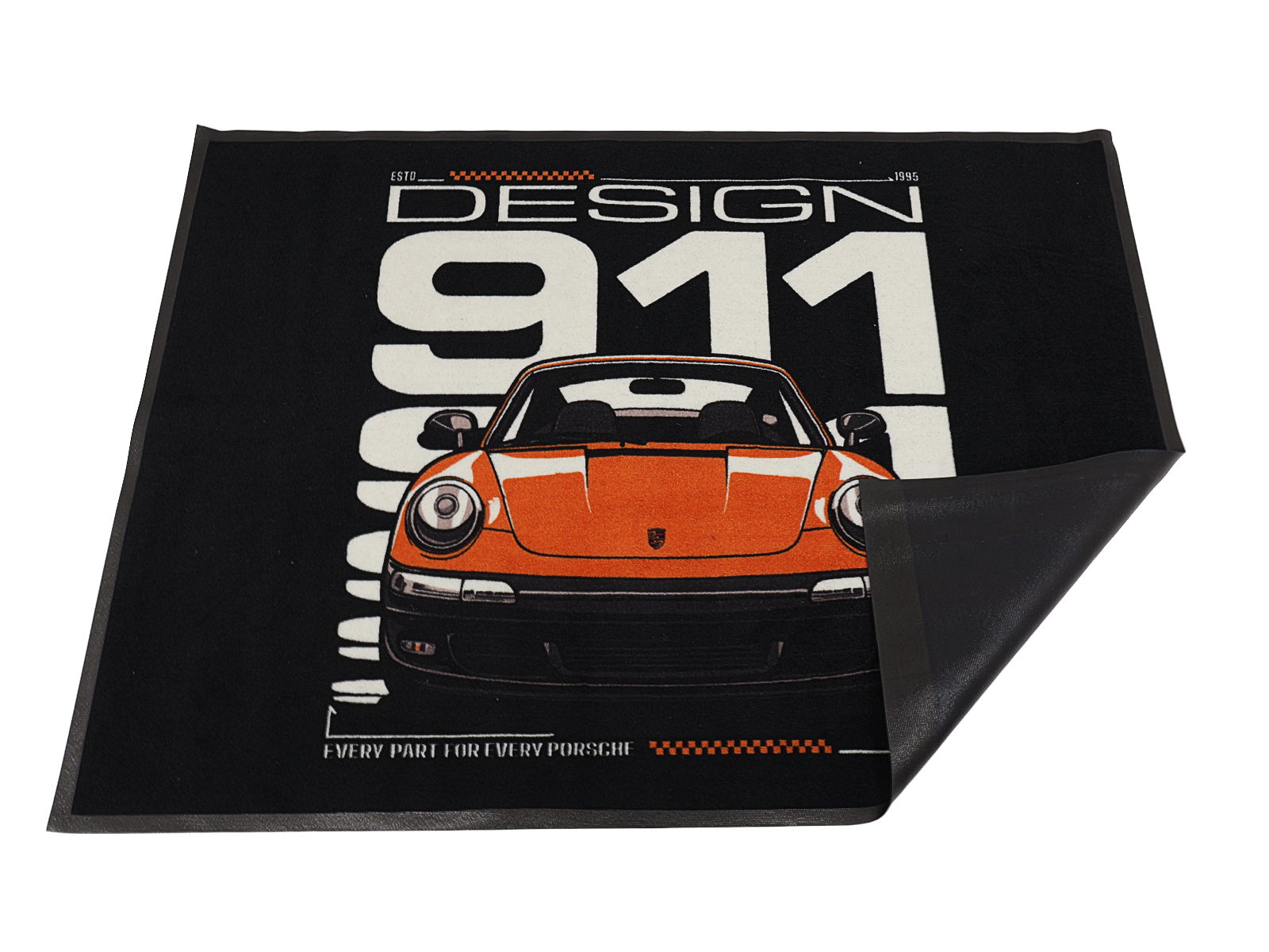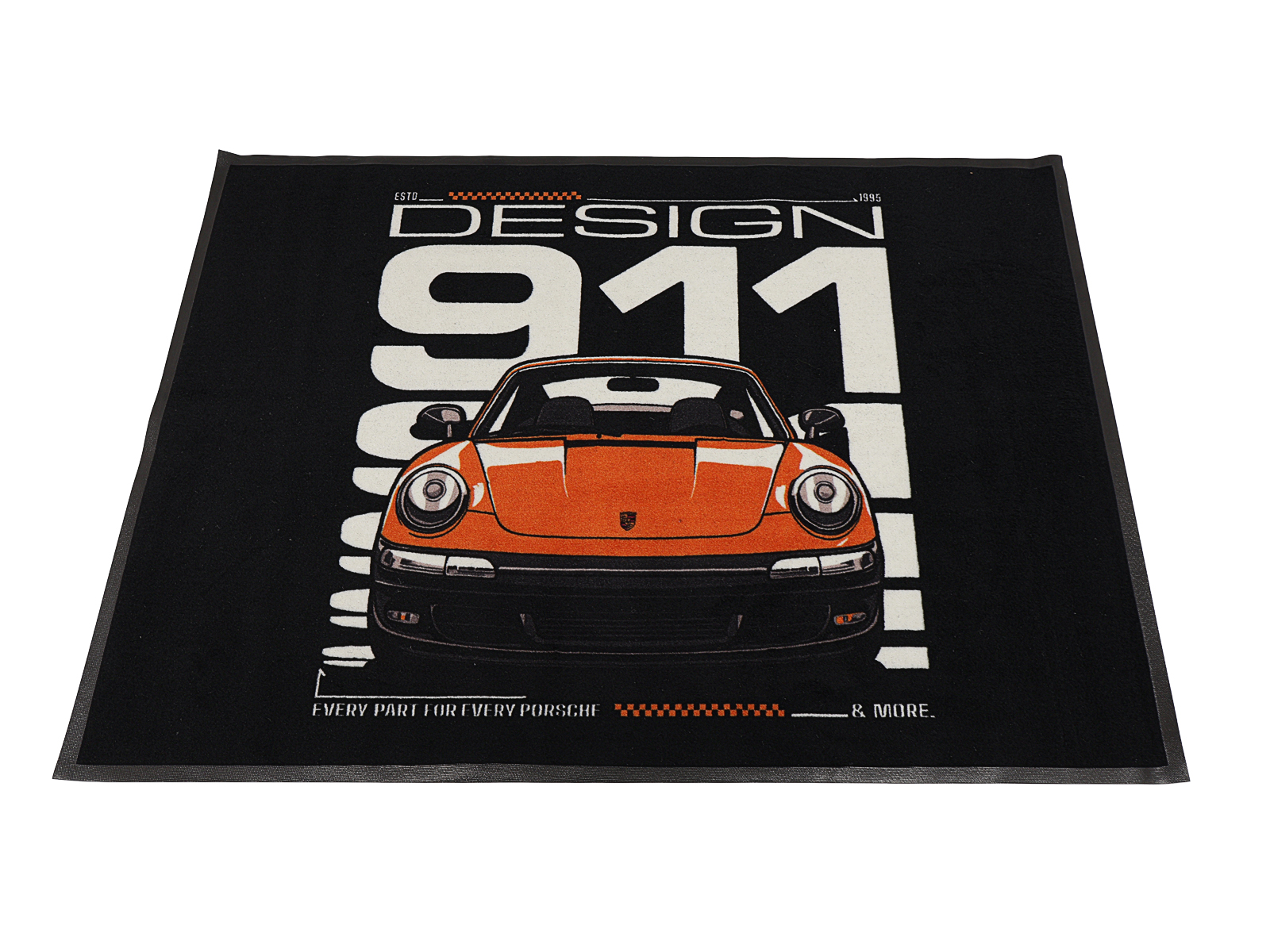 Affirmez votre style dans votre garage, votre showroom ou votre bureau avec ce tapis haut de gamme DESIGN911. Mesurant 1,40 mètre sur 1 mètre, ce tapis grand format présente un fond noir élégant orné du logo emblématique DESIGN911 et d'une Porsche 911 orange vif au centre.