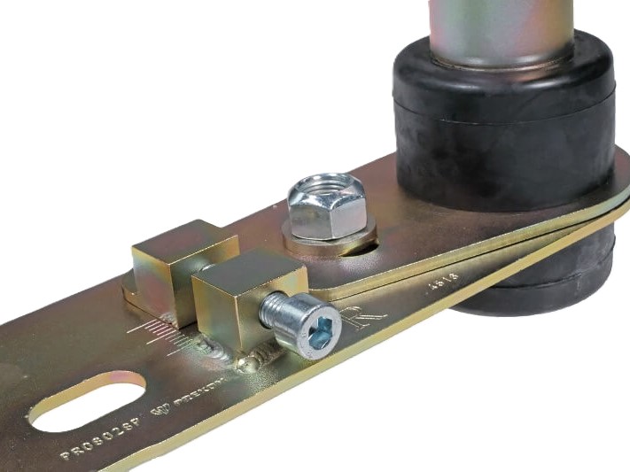 - Les plaques à ressort permettent également d'indexer la précharge de la barre de torsion et de régler la hauteur de caisse (entre autres considérations géométriques). L'utilisation de plaques à ressort réglables offre une plus grande flexibilité pour ajuster la hauteur de caisse et l'équilibre en virage sans démonter la barre de torsion ou l'essieu.