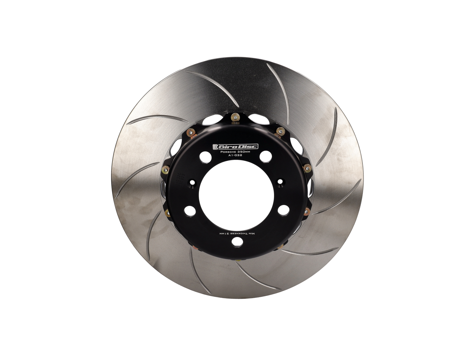 La section centrale du chapeau de notre rotor est fabriquée à partir d'aluminium de spécification aéronautique 6061-T6 provenant strictement des États-Unis. Le disque est fabriqué à partir de notre propre fonte exclusive, coulée aux États-Unis et usinée du début à la fin en interne chez Girodisc. Le rotor utilise une conception à aubes incurvées, développée en course pour agir comme une pompe centrifuge pour forcer l'air de refroidissement à travers le disque.