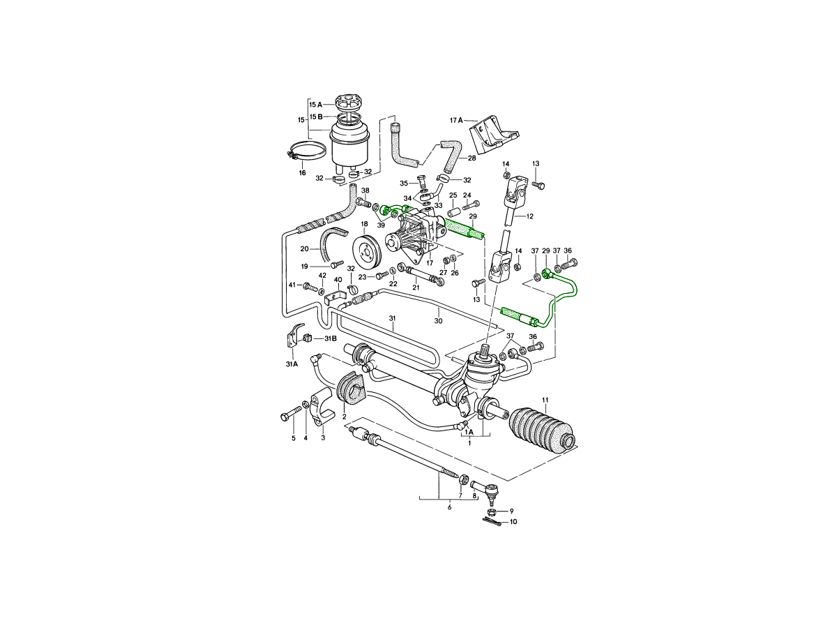 Il tubo flessibile ad alta pressione del servosterzo è un componente idraulico fondamentale nel sistema sterzante della Porsche 944 (modelli con guida a sinistra). Questo tubo flessibile ad alta pressione trasporta il fluido idraulico dalla pompa del servosterzo alla cremagliera dello sterzo, consentendo una sterzata fluida e controllata e riducendo lo sforzo del conducente.