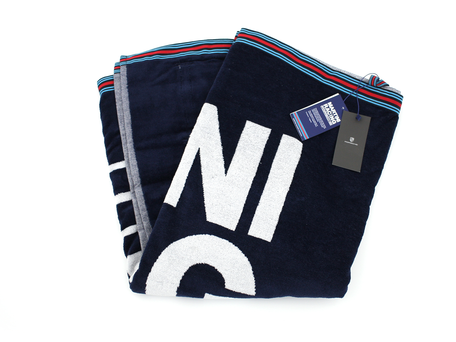 Asciugamano in tessuto jacquard nel design MARTINI RACING®. Tomaia blu scuro in morbido velour e lato inferiore in spugna bianca. Con nastro decorativo cucito e passante nei colori MARTINI RACING®. Con tasca in velcro fissata sul lato inferiore per gli effetti personali [smartphone, chiavi, ecc.].