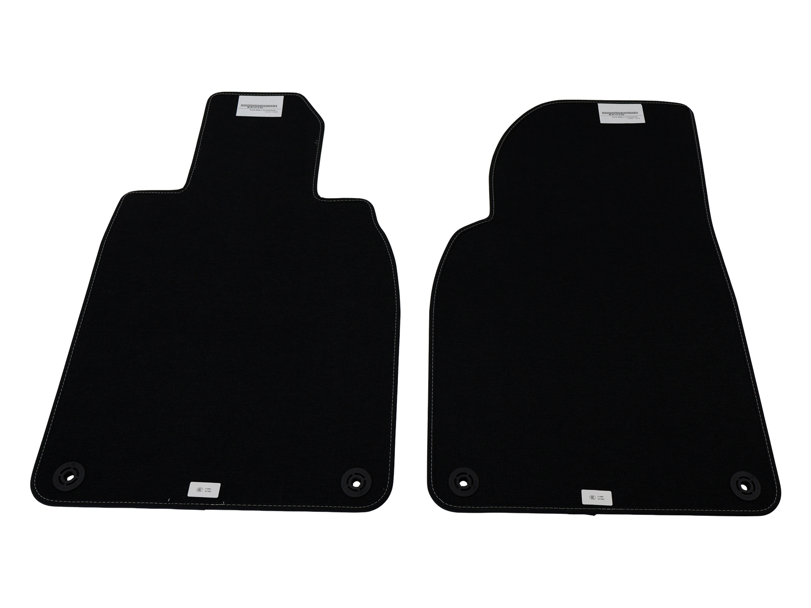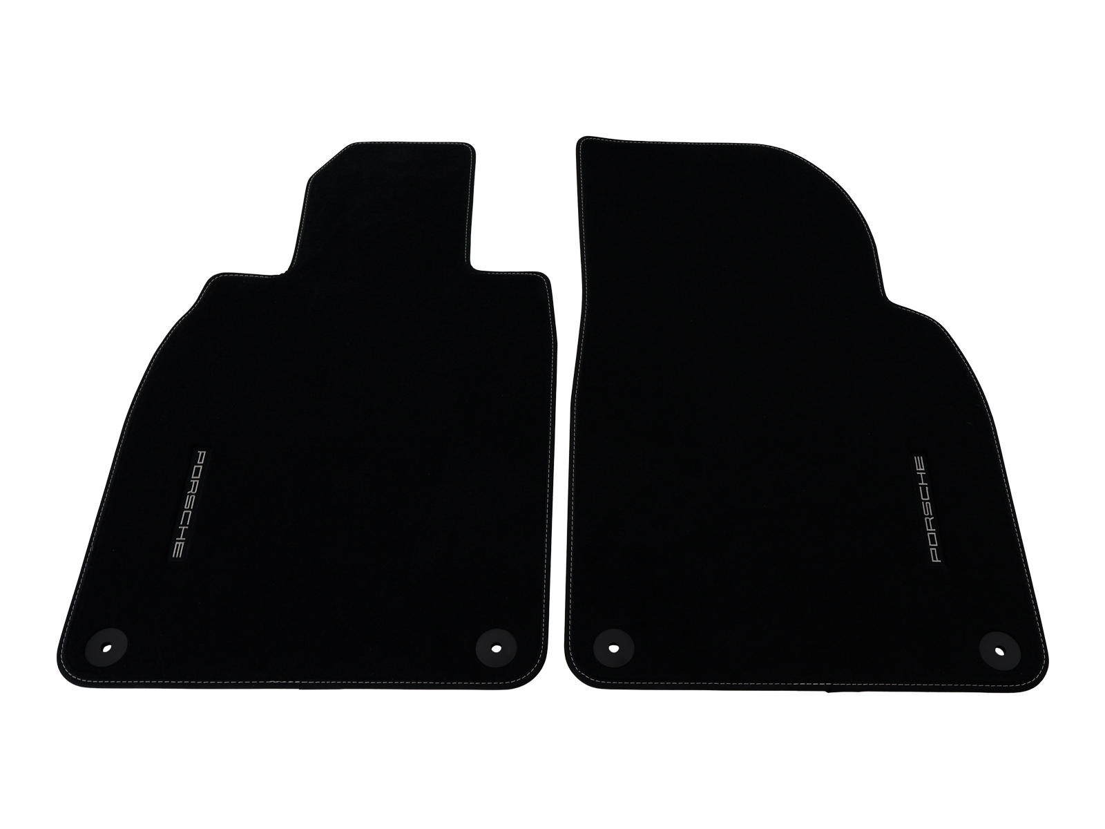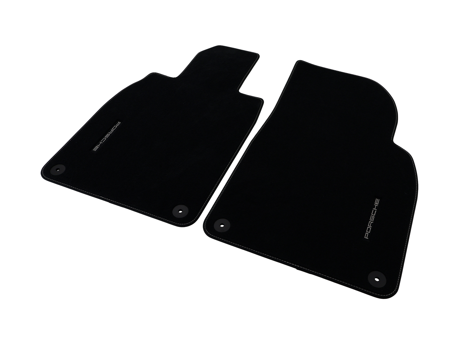 Tappetini su misura con bordo in nabuk e scritta "PORSCHE", con lato inferiore impermeabile e antiscivolo. Sono fissati da uno speciale sistema di fissaggio.