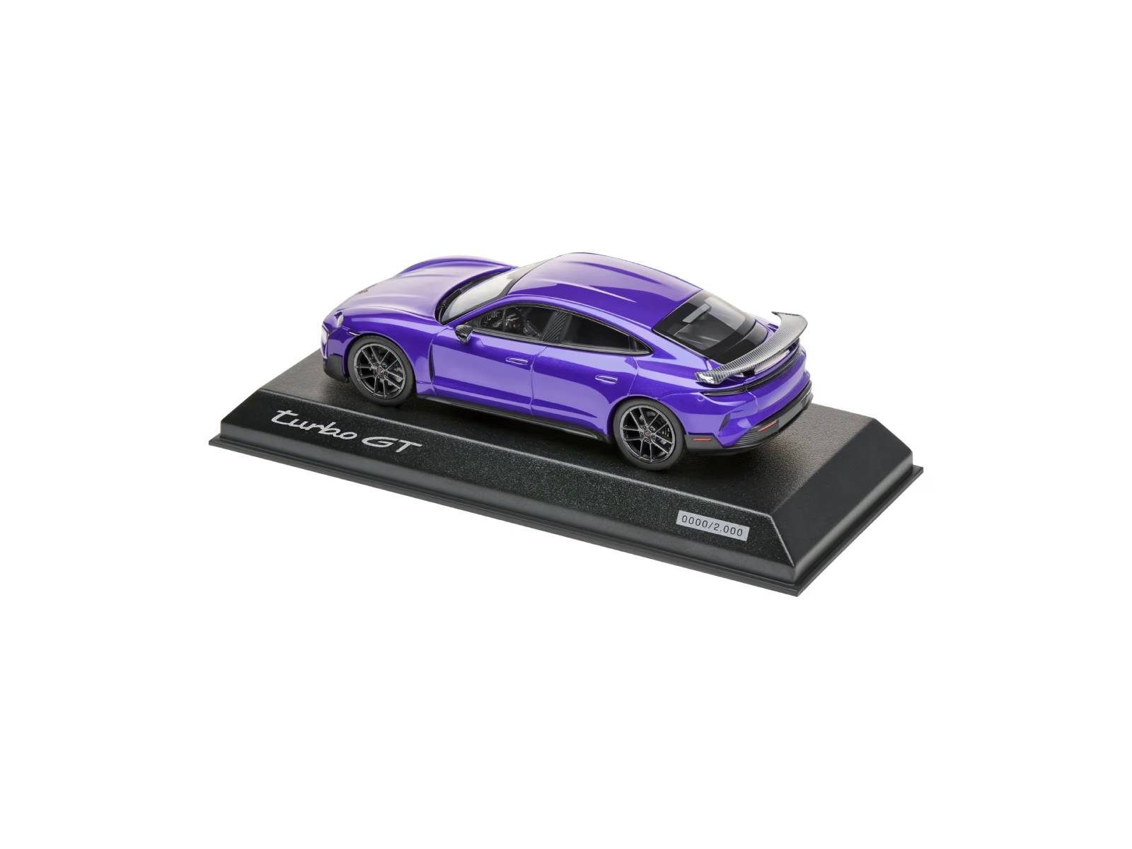 L'esclusivo modello in scala 1:18 della Porsche Taycan Turbo GT (J1 PA) con pacchetto Weissach mostra un'impressionante attenzione ai dettagli e merita un posto in qualsiasi collezione. La confezione lo rende anche il regalo perfetto per tutti gli appassionati Porsche. Realizzato in resina. Esterno Purple Sky Metallic, interni neri.