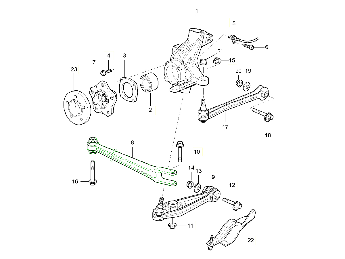 Questo braccio di controllo inferiore (talvolta chiamato "braccio laterale posteriore/braccio di sospensione") è utilizzato per le sospensioni posteriori dei modelli Porsche 987 (Boxster/Cayman), sia Gen1 che Gen2. Il componente è fornito come braccio singolo (sinistro o destro). Per risultati ottimali e un comportamento bilanciato delle sospensioni, si consiglia la sostituzione di entrambi i bracci posteriori (sinistro + destro) quando le boccole o i giunti mostrano segni di usura.
