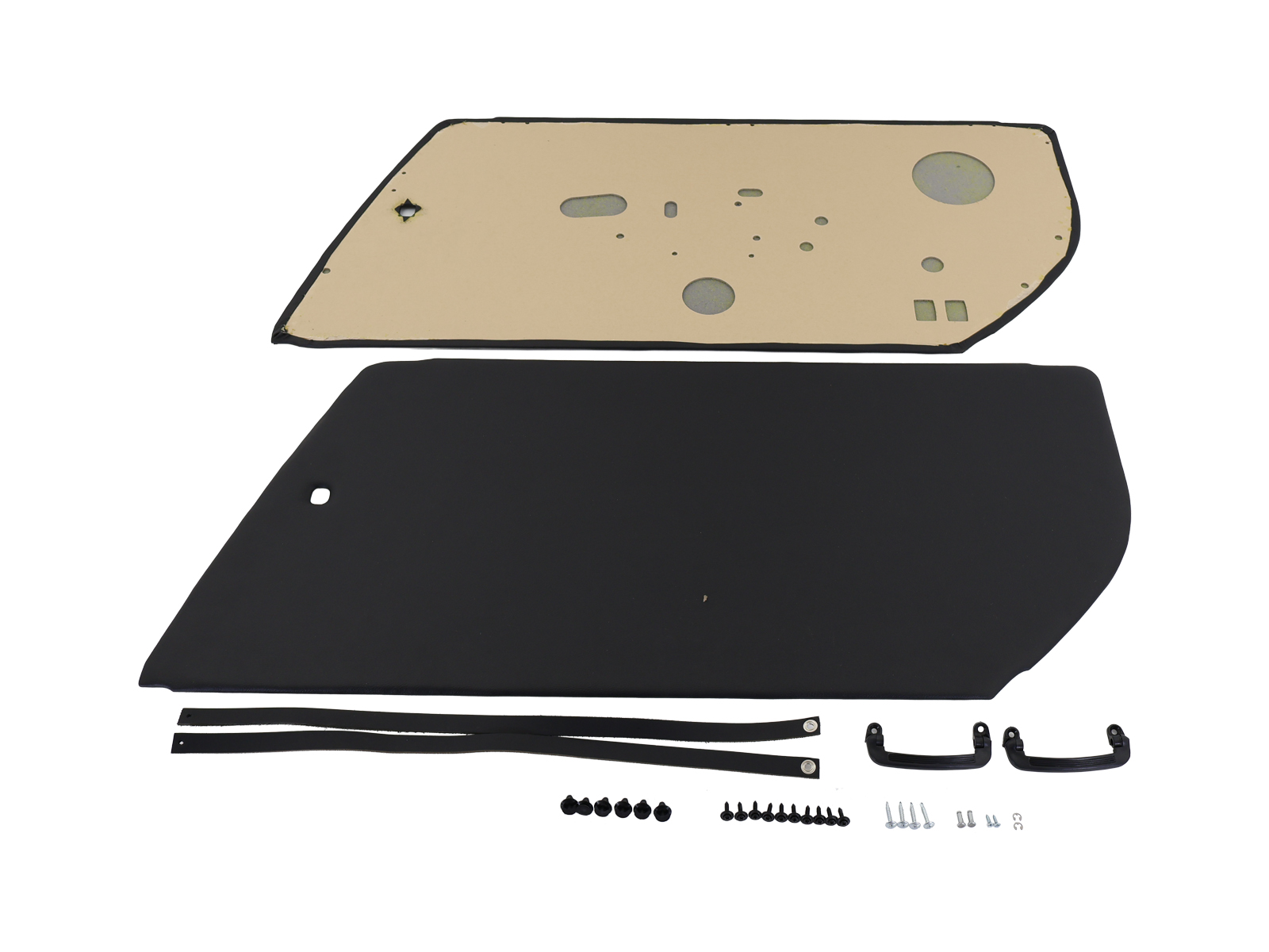 Deze set is bekleed met zwart leer materiaal. Alle gaten in de vezelplaat en isolatie zijn met precisie gestanst (geen bovenfrezen of reciprozagen). Stansen zorgt voor een perfecte pasvorm en ze klikken meteen vast. Je knipt gewoon de afdekking voor de accessoires die je hebt uit en plaatst ze erop.