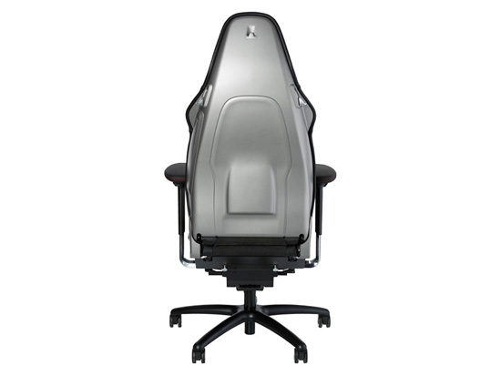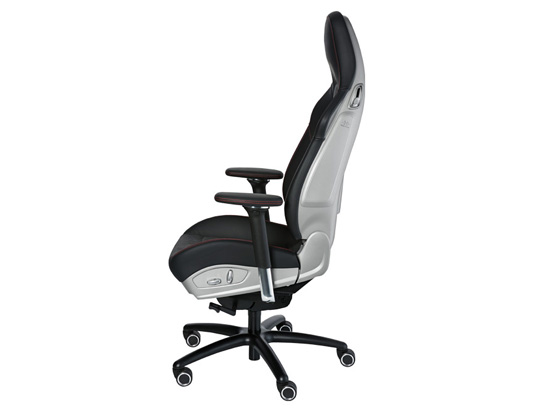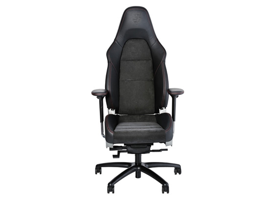 Originele sportstoel [ 4-way Plus ] zoals te zien in de huidige Porsche 911 Carrera. Traploze zithoogteverstelling. Elektrische rugleuningverstelling aangedreven door oplaadbare batterij. Verstelbare armleuningen. Met haak voor jack aan de achterkant en Porsche embleem op het hoofdgedeelte. Gedeeltelijk lederen stoelen met middengedeelte van origineel Porsche Alcantara-materiaal en rood contrasterend stiksel. Schaal gemaakt van grijs-zilver composiet. Zwarte naafvoet [ mat ] met 5 zwenkwielen voor optimaal comfort op zowel harde als zachte vloeren.