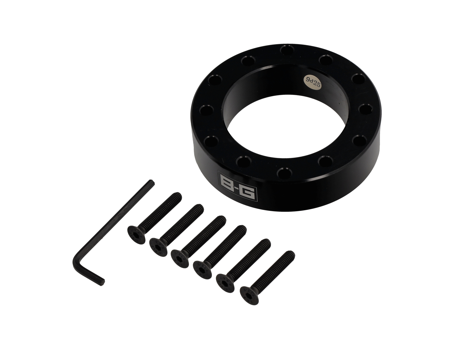 De BG Racing 80 mm stuurwielafstandhouder met zwart geanodiseerde afwerking is gemaakt van hoogwaardig aluminium en wordt geleverd met bevestigingsschroeven.