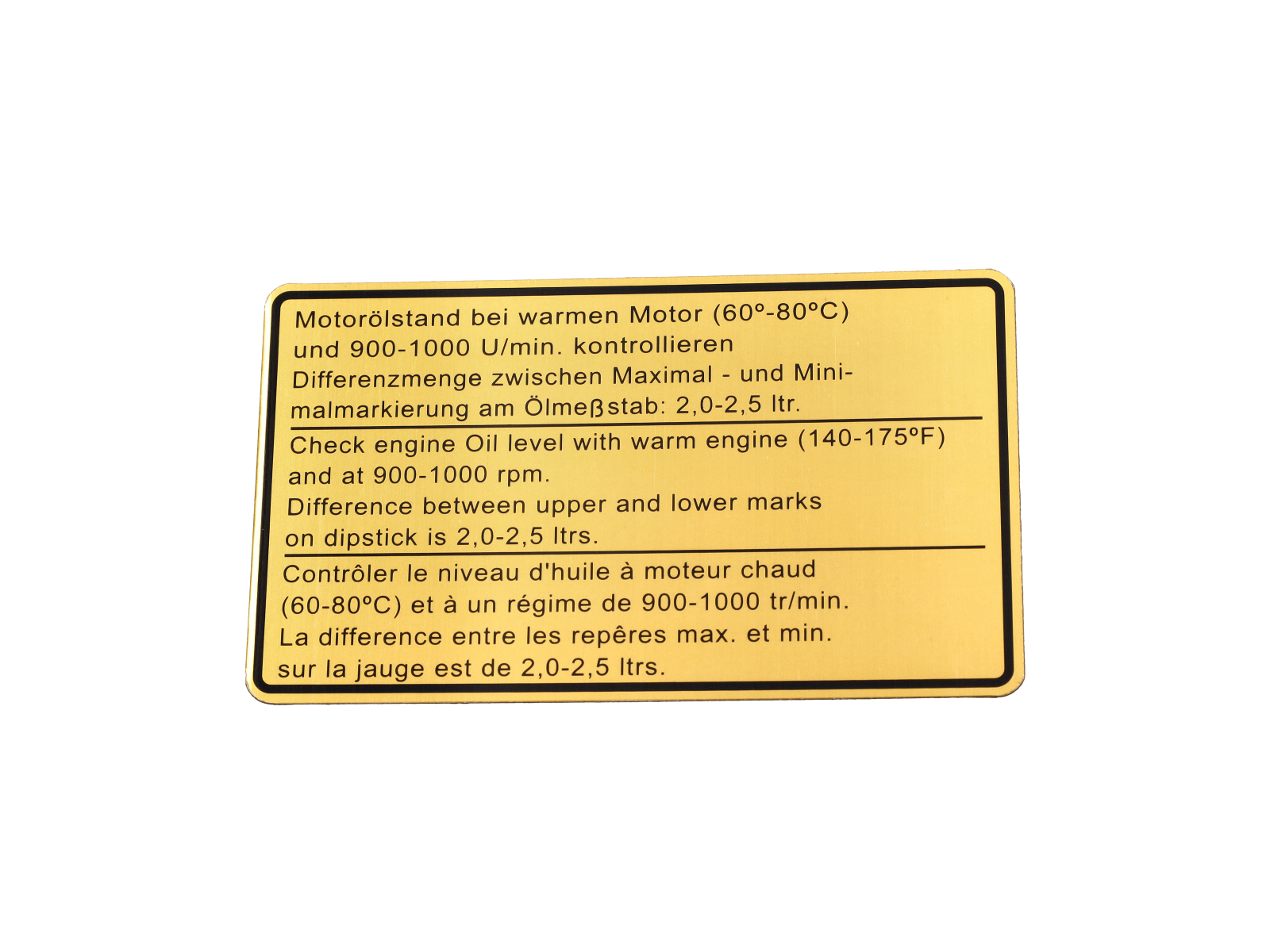 Het label is op de dwarsbalk van de motor (of een geschikte plek in de motorruimte) aangebracht om het juiste oliepeil aan te geven. Het zorgt voor goed onderhoud en een snelle visuele controle van het oliepeil.