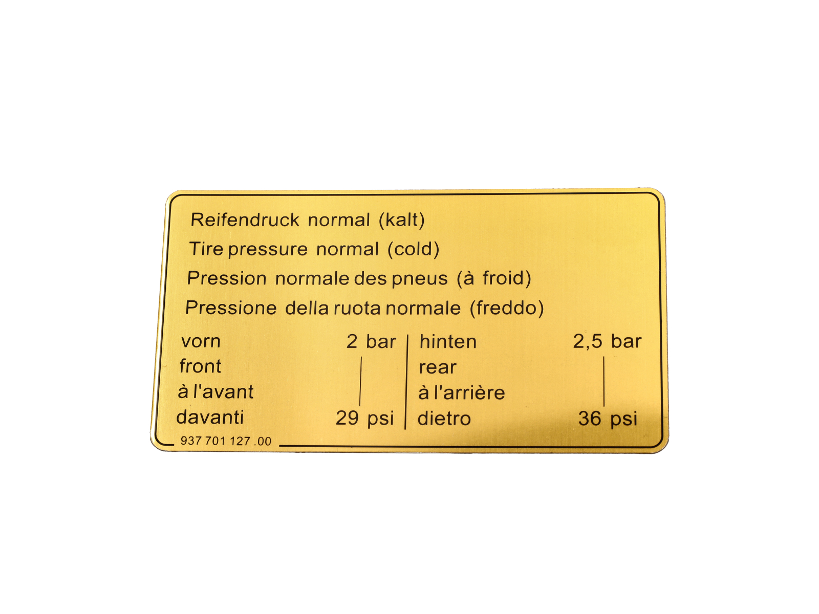 Bandenstickers zijn essentiële identificatie- en informatielabels die op Porsche-voertuigen worden aangebracht en de aanbevolen bandenspanning, -maten en -specificaties weergeven. Deze stickers spelen een belangrijke rol bij het garanderen van correct bandenonderhoud en -prestaties en dragen bij aan de authentieke uitstraling van het interieur, de bagageruimte of de portierstijl van uw Porsche. Of u nu een klassiek model restaureert of een modern model onderhoudt, een duidelijke en nauwkeurige bandensticker is zowel functioneel als visueel belangrijk.