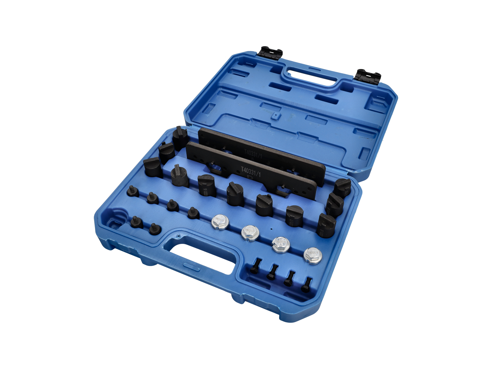 Nauwkeurige nokkenasvergrendeling tijdens het verwijderen of installeren van de distributieketting Nauwkeurige uitlijning van nokkenassen ten opzichte van de krukas Veilig onderhoud van distributieketting, geleiders en spanners Correcte afstelling voor actuatoren met variabele kleptiming (VVT) Stabilisatie van timingcomponenten tijdens revisies Nauwkeurigheid van professionele kwaliteit voor diagnose- en onderhoudswerkzaamheden aan EA839-motorenWanneer u deze gereedschapsset correct gebruikt, bent u verzekerd van een perfecte timing van de geavanceerde V6-motoren van Porsche.
