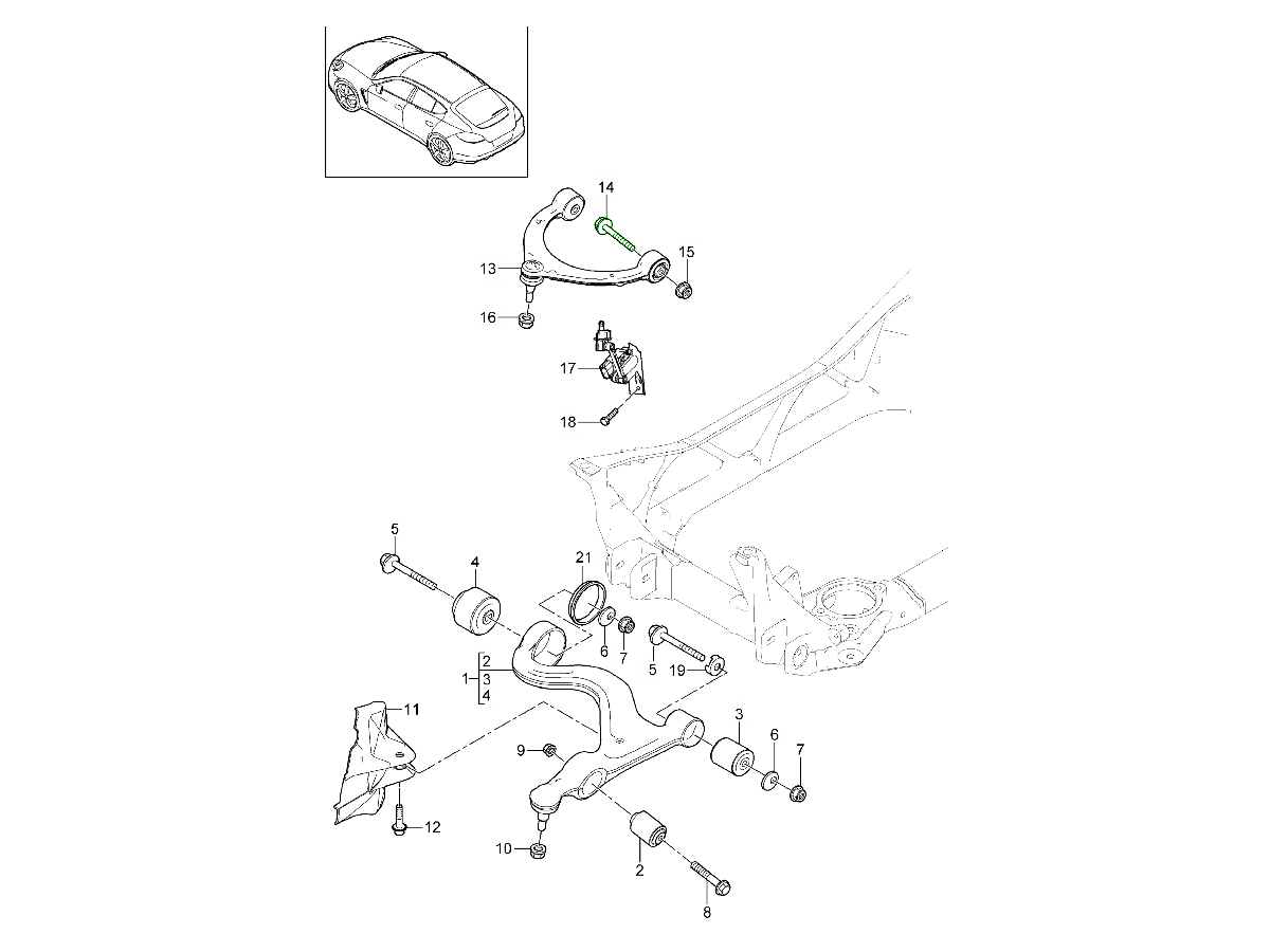 Deze originele bevestiging is essentieel bij het vervangen of onderhouden van voorste draagarmen, subframecomponenten of bij het uitvoeren van een volledige uitlijning op Panamera-modellen. Zo bent u verzekerd van authentieke fabrieksprecisie en betrouwbaarheid op de lange termijn.