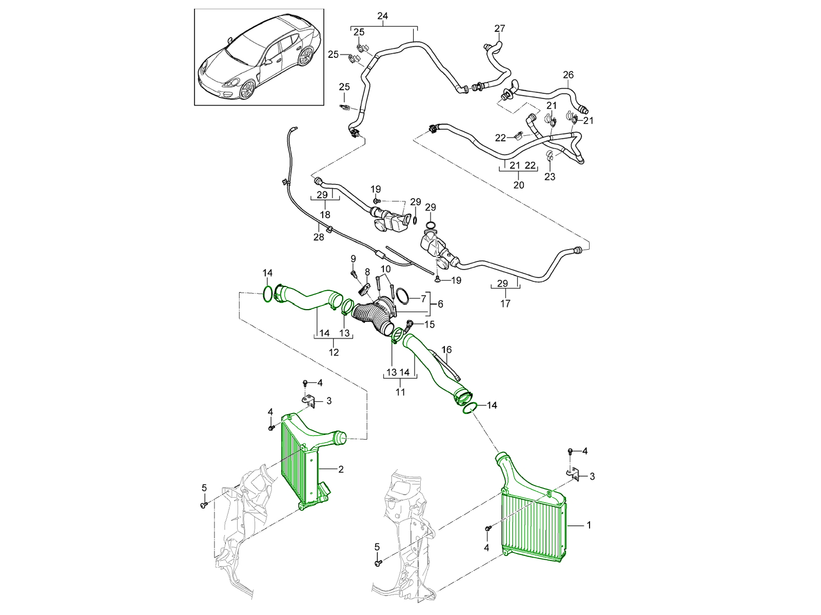 Charge oil cooler and pipesThis OE Match intercooler and pipes set is a complete twin-intercooler cooling solution designed to replicate the original Porsche charge-air cooling components for the 970 Panamera 4.8 L Turbo. The kit includes both left and right intercooler cores and matching pressure pipes, providing an integrated, direct-fit replacement package engineered for proper boost airflow and turbo efficiency.