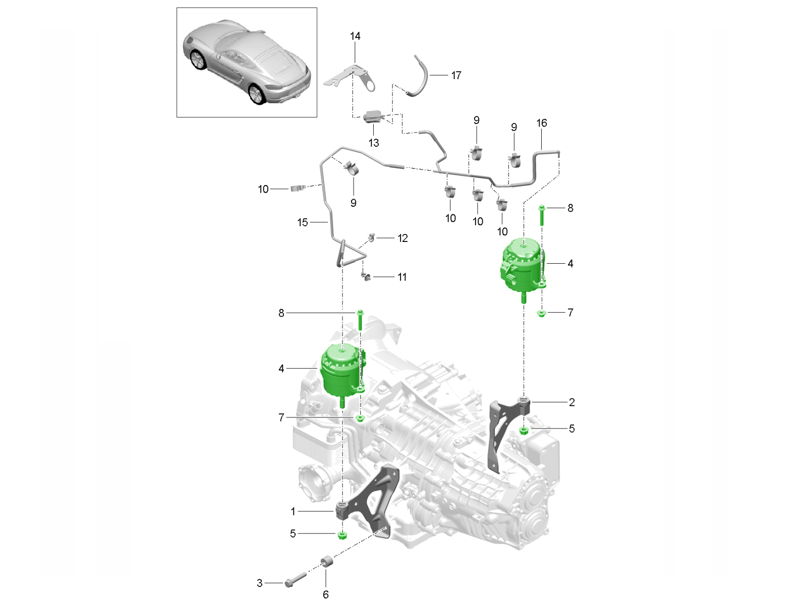 This complete Genuine Porsche Gearbox Mount Kit includes two hydraulic gearbox mounts (982399201A) together with all required original mounting hardware for installation. The kit is designed to support the engine and transmission assembly on Porsche 718 Boxster and 718 Cayman (982) models without Dynamic Engine Mount