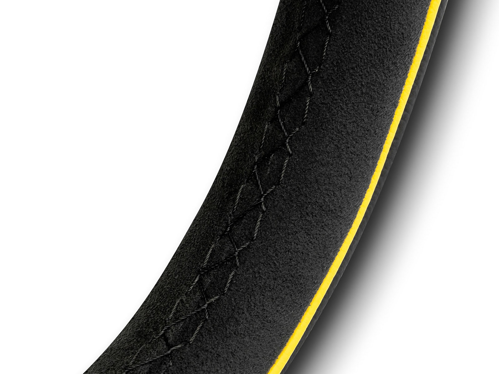 • Anatomically contoured grip crafted from leather and black microfibre, enhanced with a distinctive yellow leather insert
