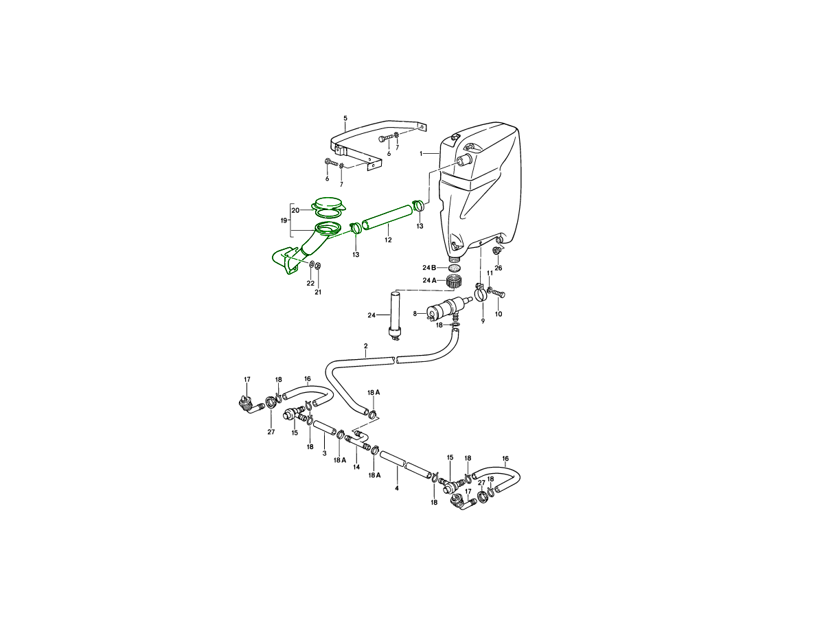 The filler neck directs washer fluid safely into the reservoir. The connecting hose ensures proper transfer without leakage. The cap seals the system to prevent contamination and spillage.