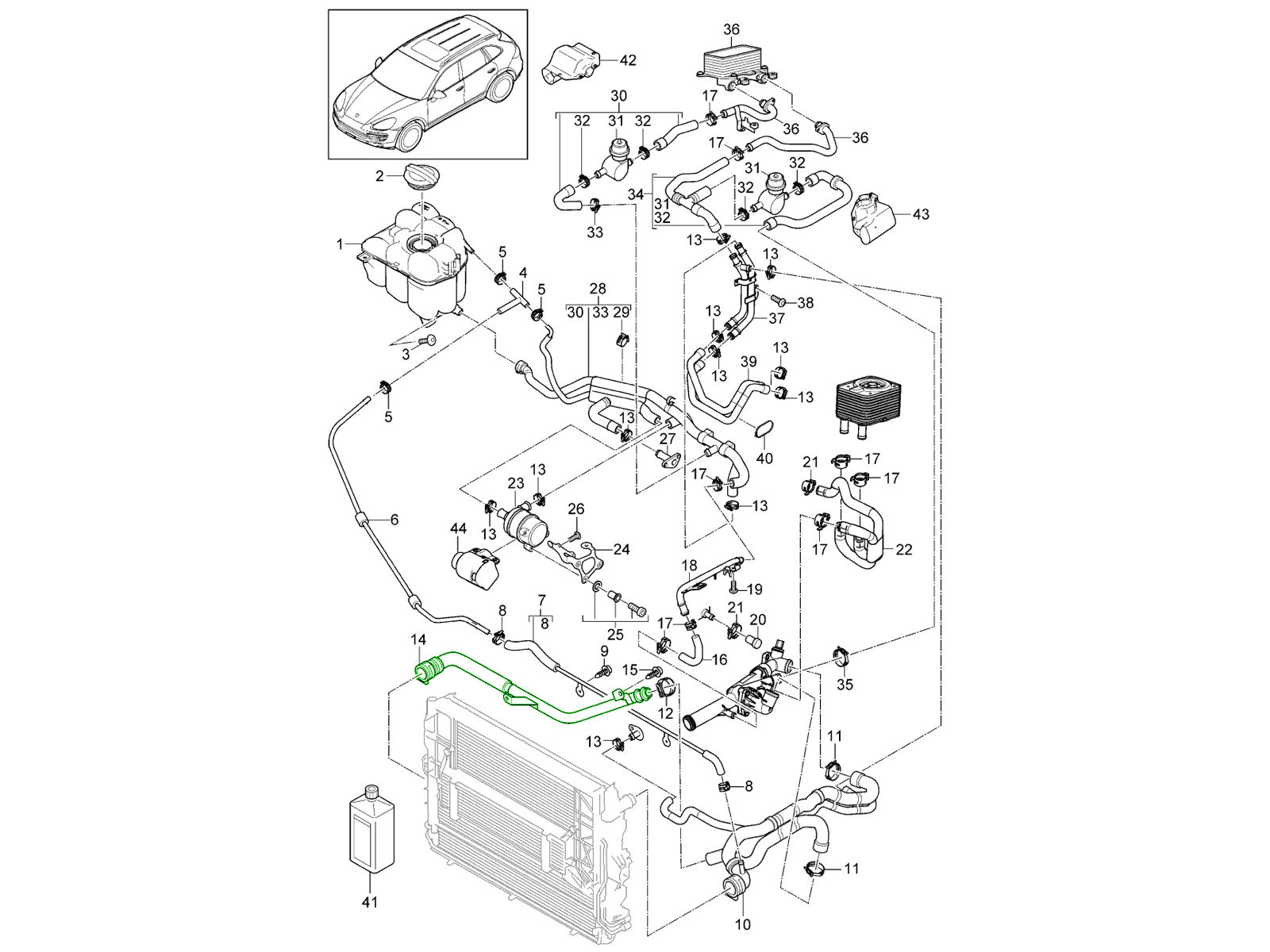 • Location: Connects radiator outlets to coolant pathways (lower/centre position in Cayenne cooling diagrams)