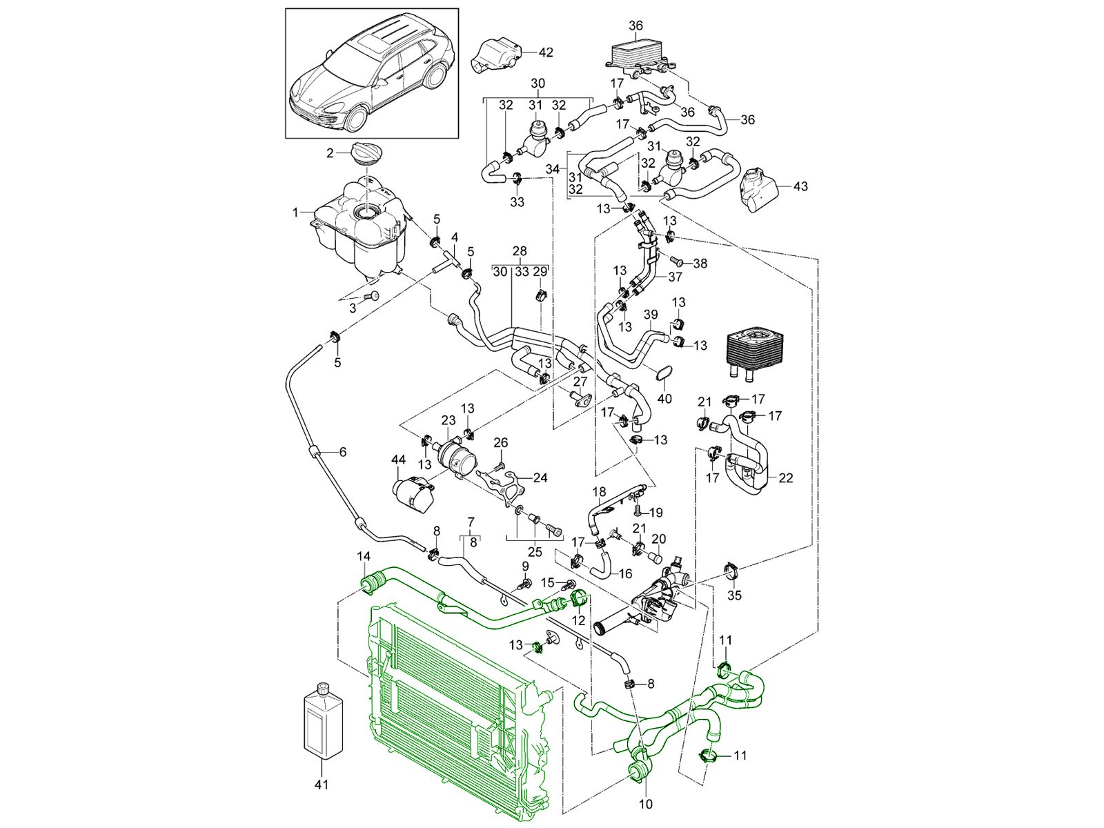 Radiator water with hoses, Centre.This complete radiator water, hose, and mounting kit is a service solution for the Porsche Cayenne 958 3.6 L (2011–2018) cooling system. It combines a durable OE Match radiator core with both OE and OE Match cooling hoses, genuine mounting components, and all necessary clamps - delivering everything needed to refresh the core section of the engine’s cooling circuit in one comprehensive set.