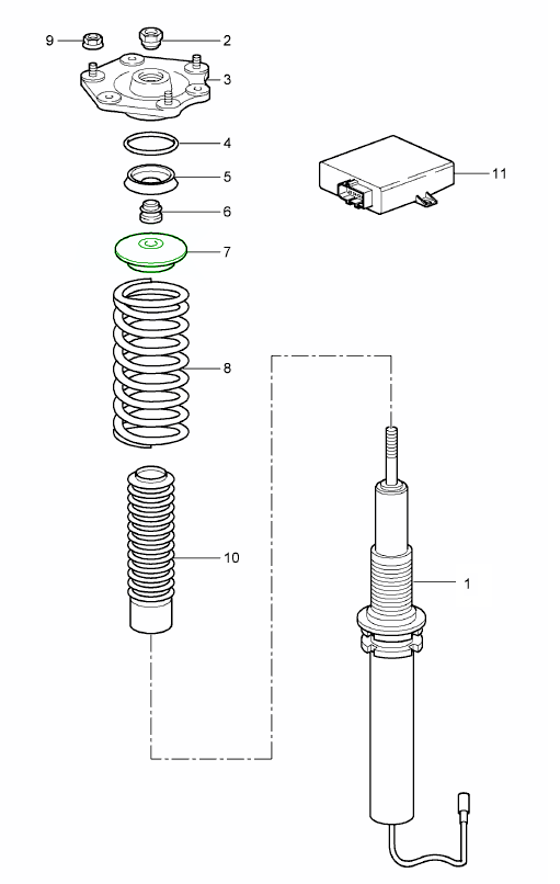 • Position on Vehicle: Mounted at the top of the front suspension strut/damper assembly, under the front sub-frame, where it supports angular movement and load transfer through the bearing above the strut.