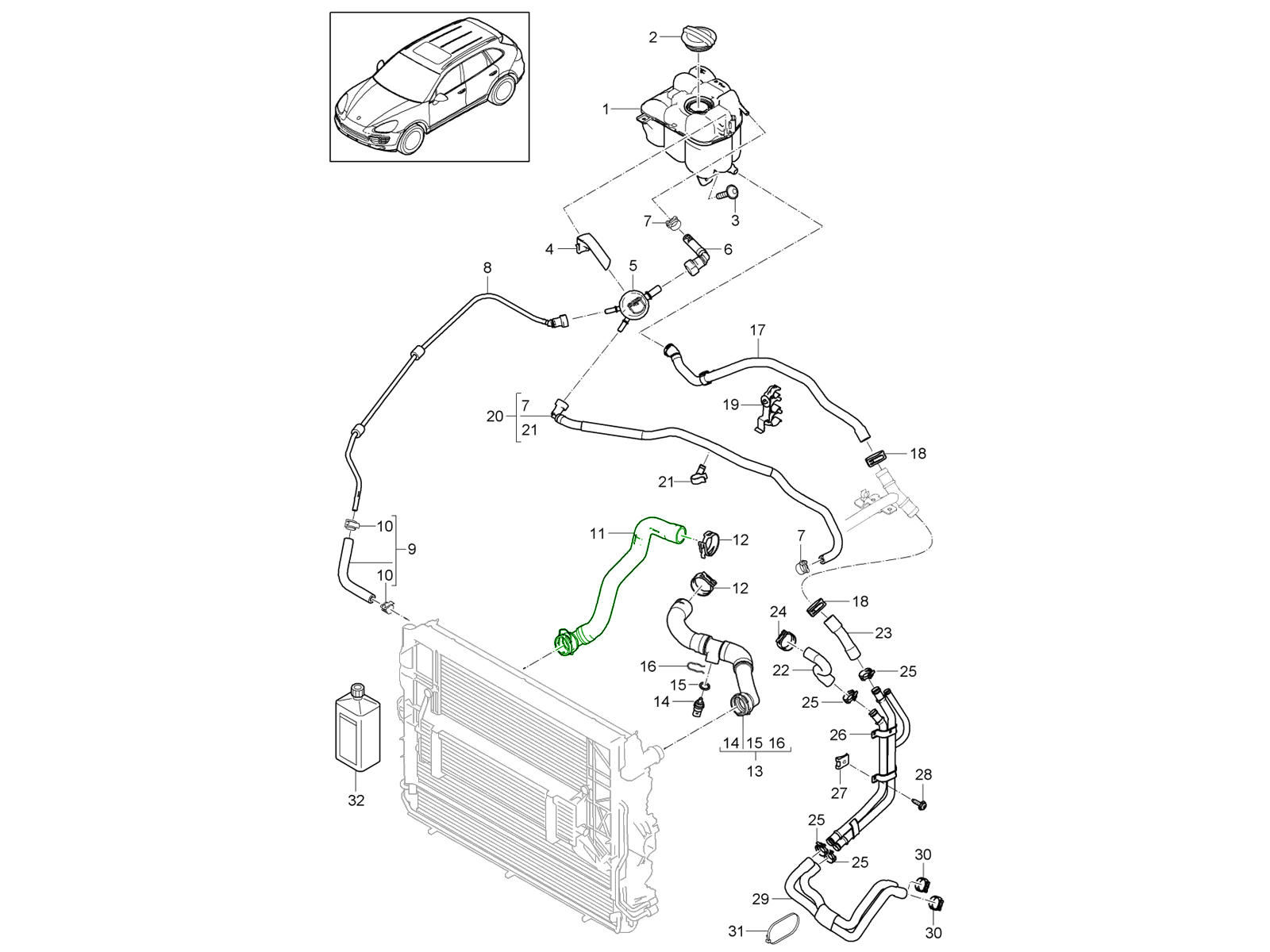 Water coolant top hose, supply.This genuine Porsche water coolant top hose is designed to maintain correct hose routing, fitment, and material performance in the engine cooling system of high-performance Porsche Cayenne V8 models.