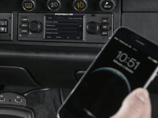State-of-the-art navigation technology makes travelling to your destination a breeze - and provides a clear overview of how to get there. The system display and operation have been optimized to suit the high-definition 3.5-inch display. Route guidance can be shown in a choice of 2D, 3D or pure arrow view. The integrated Traffic Message Channel warns of any unpleasant surprises. And no one need miss their everyday digital comforts. Interfaces for iPhone®, iPod®, USB and AUX are of course available, allowing external music sources to be managed via the display. Bluetooth® - with internal and external microphone -enables in-car phone calls to be made. The Porsche Classic Radio Navigation System therefore allows classic vehicles with an analogue past to enjoy a digital future with enhanced sound.