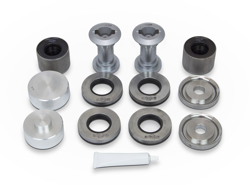Finally a way to replace the rubber trailing arm bushings without buying new trailing arms. This is a complete kit that includes rubber bushings, metal cores, pressing tools, and lubricant. Everything you need to replace bushings on a pair of 964 trailing arms.