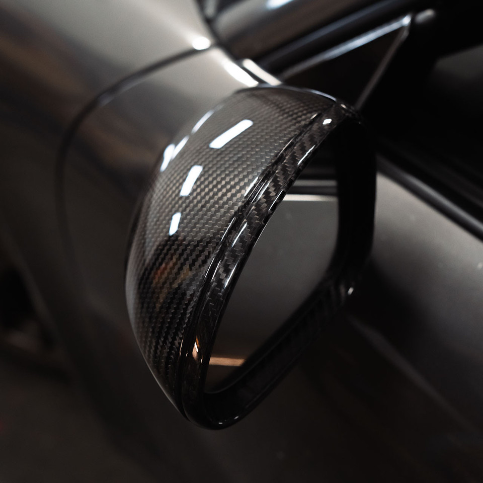 Rennline's carbon fiber mirror shells are a great way to give your Porsche a subtle yet modern exterior upgrade. Made from high quality carbon fiber using the latest technology, our mirror shells are designed with the dimensions of the OEM pieces for a factory fit and finish while adding a bit of style. Take your old plastic pieces out and install ours in their place. Installs in minutes reusing the factory hardware.