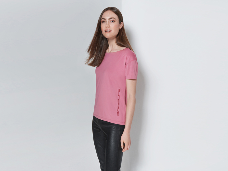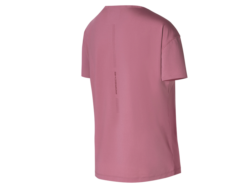 Loose-cut T-shirt with inserted, perforated sleeves and wide cut-out. In functional jersey. Breathable and quick-drying. Further perforation on the back. Large, transparent glossy print with 'PORSCHE' logo on the front and additional 'PORSCHE' logo on the back. Laser-cut and bonded edges on neckline and sleeve hem.