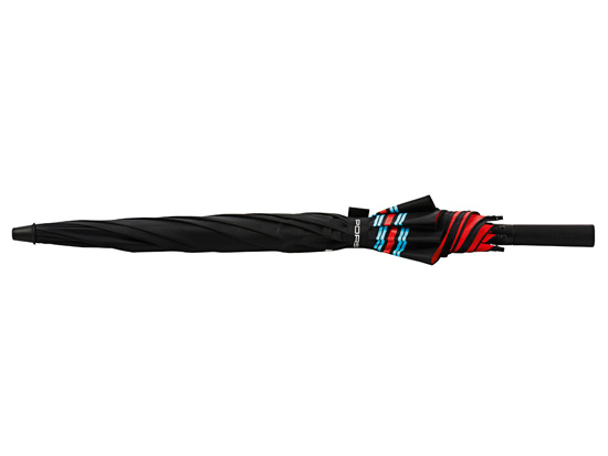 Porsche Umbrella – MARTINI RACING CollectionLarge umbrella, able to fit 2 people underneath, with MARTINI RACING design. Sporty, ergonomically shaped handle with 'PORSCHE' logo. With MARTINI RACING inlay at the end of the handle and integrated automatic opening mechanism. Teflon-coated cover made of 100 % polyester. Red anodised aluminium shaft.