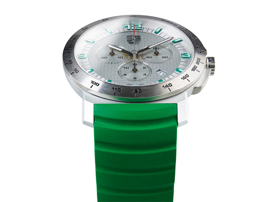 Ronda quartz movement with 13 jewels and waterproof casing [ 5 ATM ]. Luminescent hands, stopwatch function with split-time measurement and tachymeter. Satinised casing made from toughened aluminium. Extra-hard sapphire glass with anti-reflection treatment to ensure clear visibility. Screw-down crown. Metal dial. Dial base in white with a carbon structure. Rubber strap in green with stainless steel clasp. Diameter: 42 mm. Swiss made.