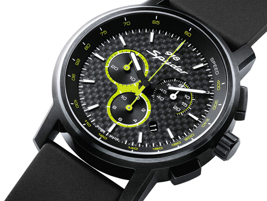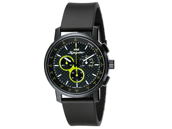 Black carbon dial with Acid Green accent. Black rubber strap. Luminescent hands, stopwatch function with split-time measurement and tachometer. Extra-hard sapphire glass with anti-reflection treatment to ensure clear visibility. Integrated rubber watchstrap with stainless steel fastener.