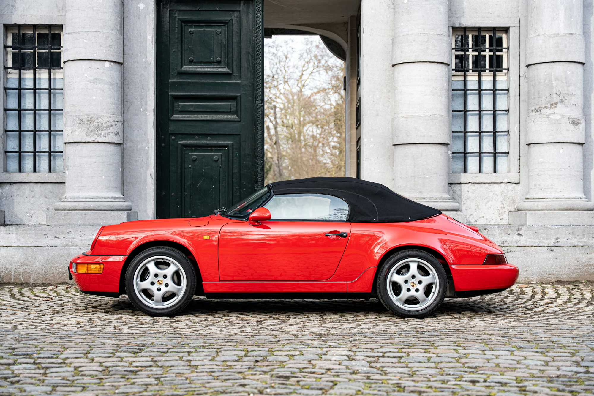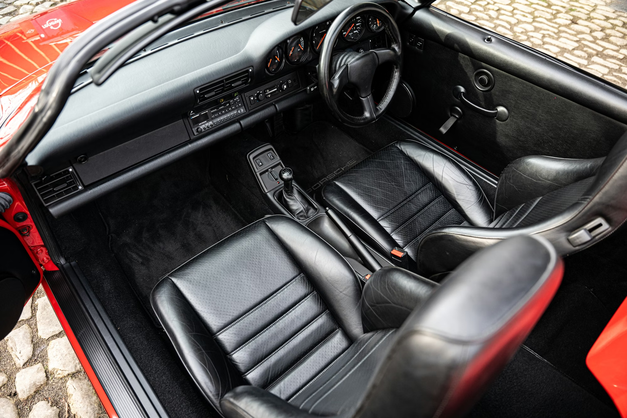 - This example is finished in the iconic shade of Guards Red with a contrasting black soft-top roof, over a black leather-trimmed interior.