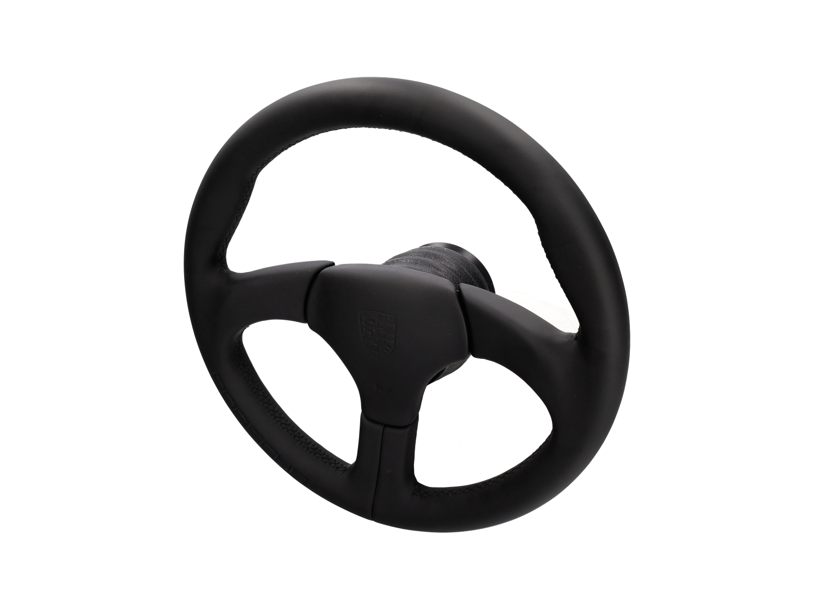 Sports steering wheel without airbag in Black. Leather covered with black stitching and embossed Porsche logo.