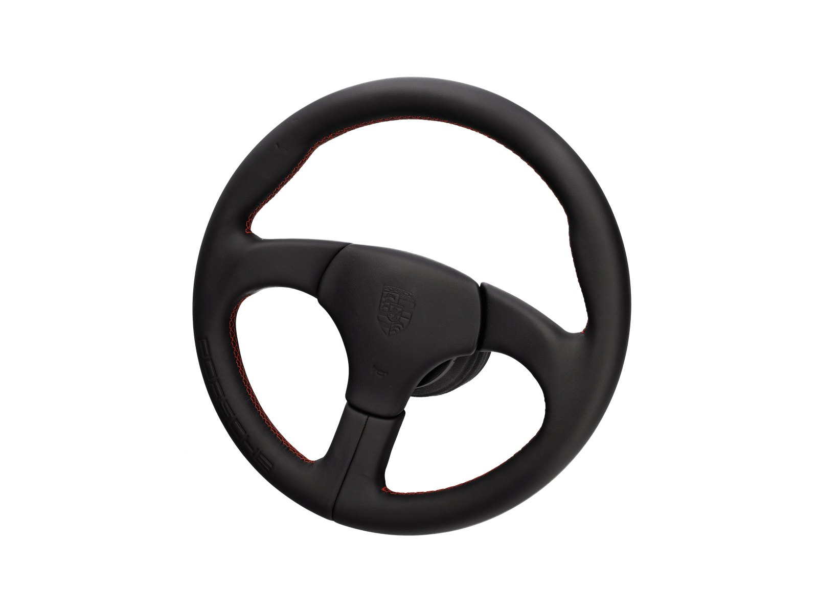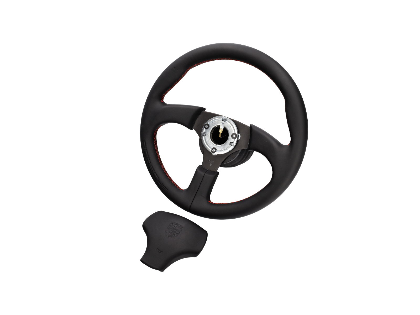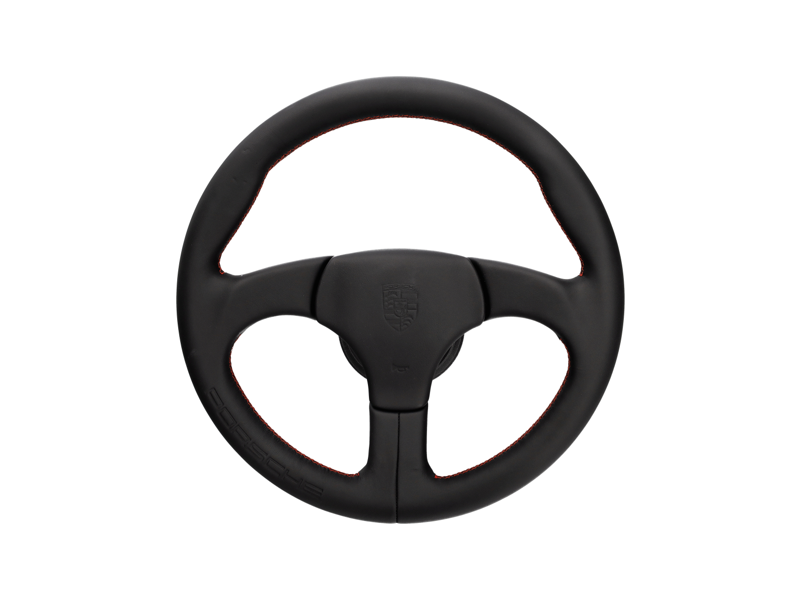Sports steering wheel without airbag in Black. Leather covered steering wheel with Guards Red stitching and embossed Porsche logo. "boss" fitting kit is included