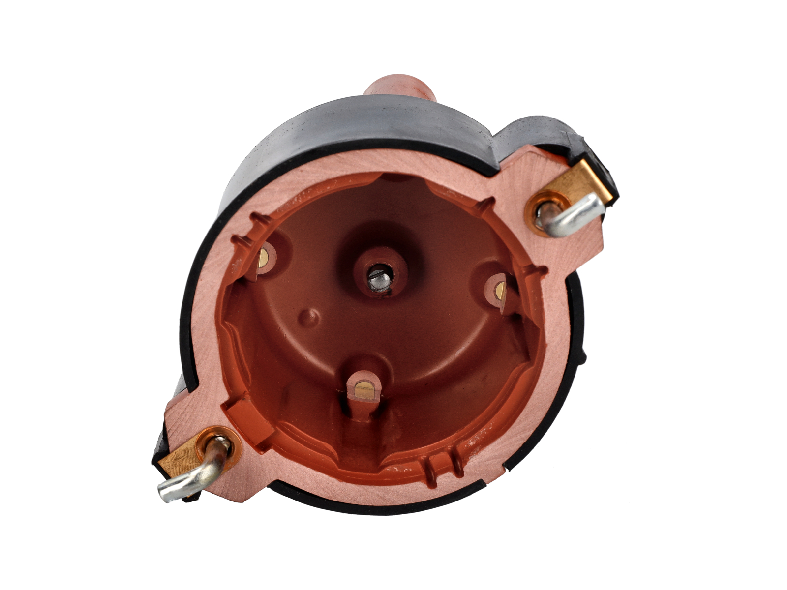 A distributor cap directs high-voltage electricity