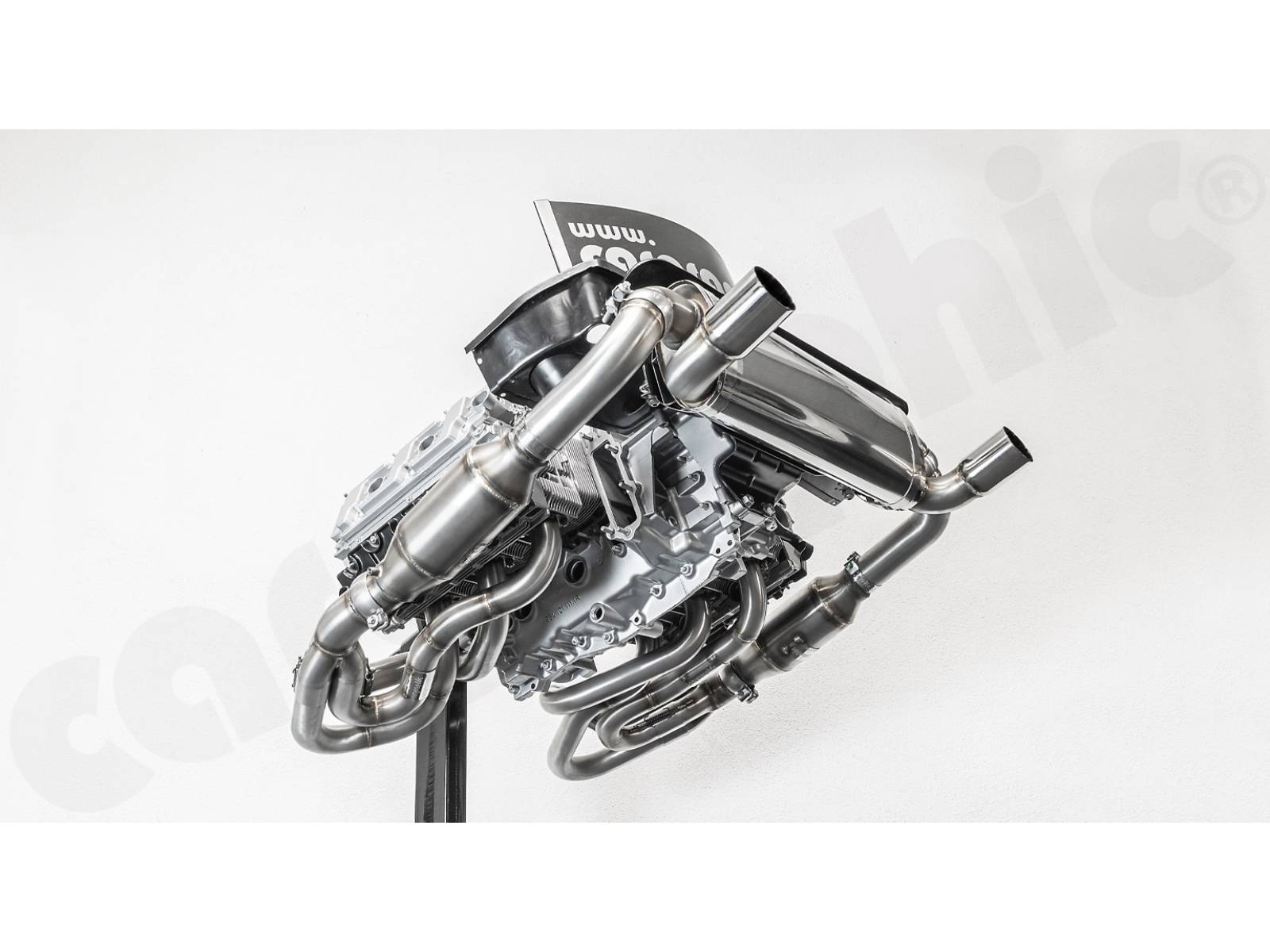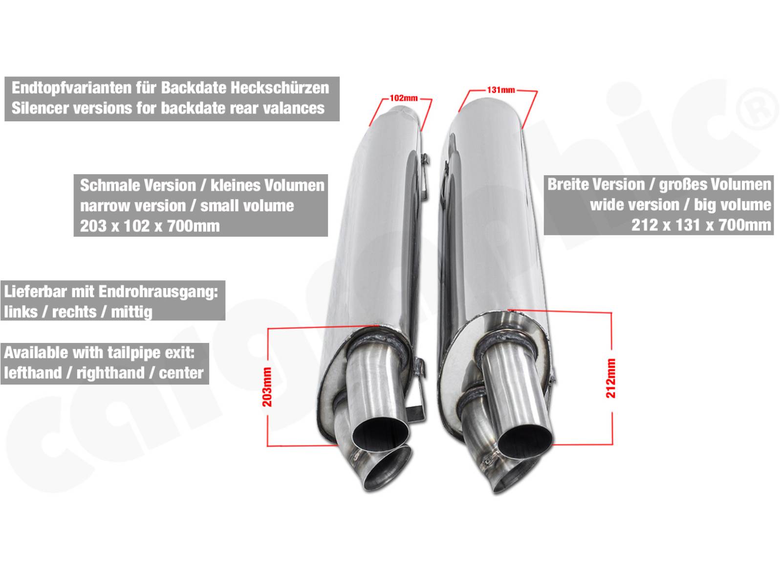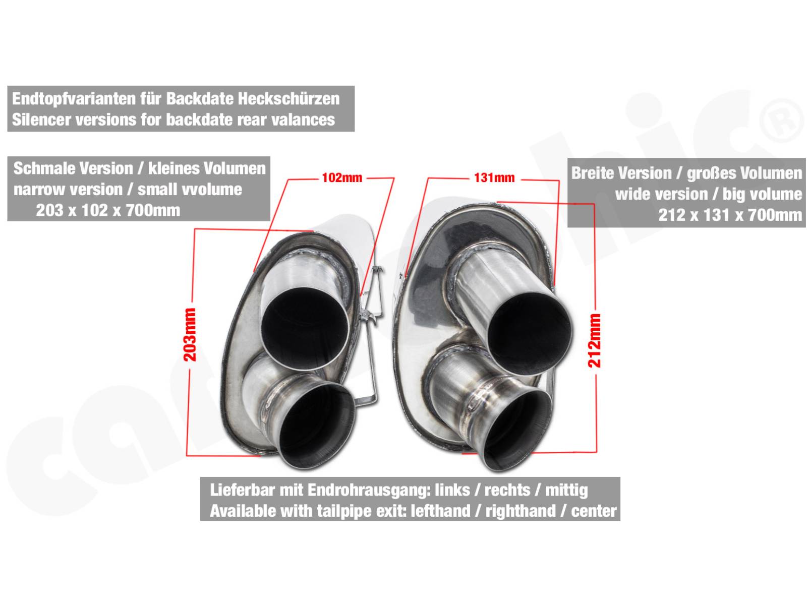 - 2x CARGRAPHIC sport tailpipes in Ø76mm welded with a CTC gap of 740mm (RSR-Look)