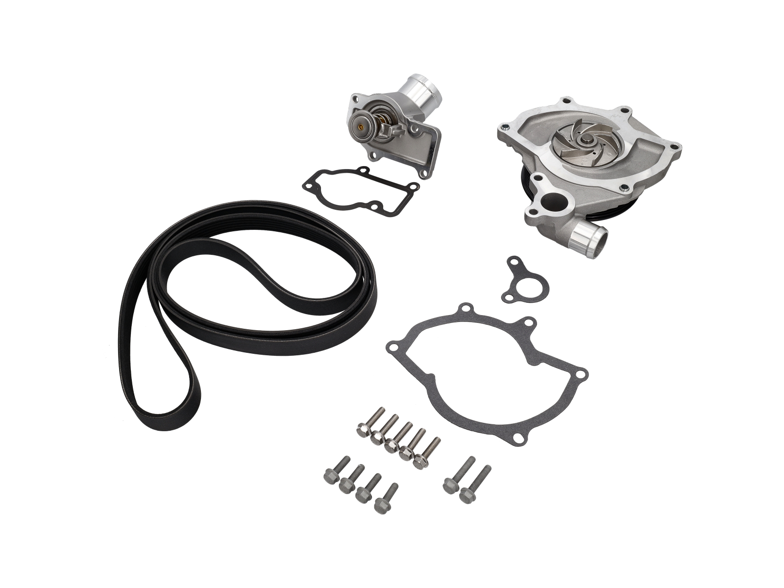 Water pump kit with drive belt and standard temperature thermostat. Kit comes with all bolts and gasket needed to complete the job. Please note we advise to get additional antifreeze (approx 6 litres). Available separately.