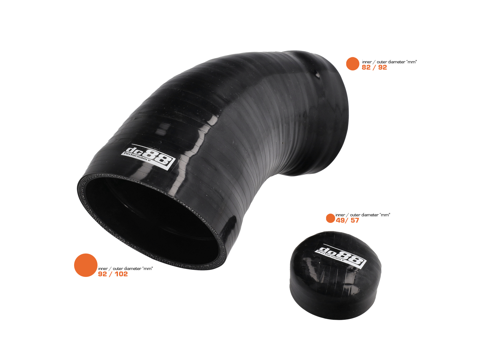 These hoses are entirely manufactured in high quality silicone for best finish and durability. With an integrated steel wire to prevent the hose from collapsing under negative pressure and three to five layers of reinforcement, depending of the inner diameter and position.