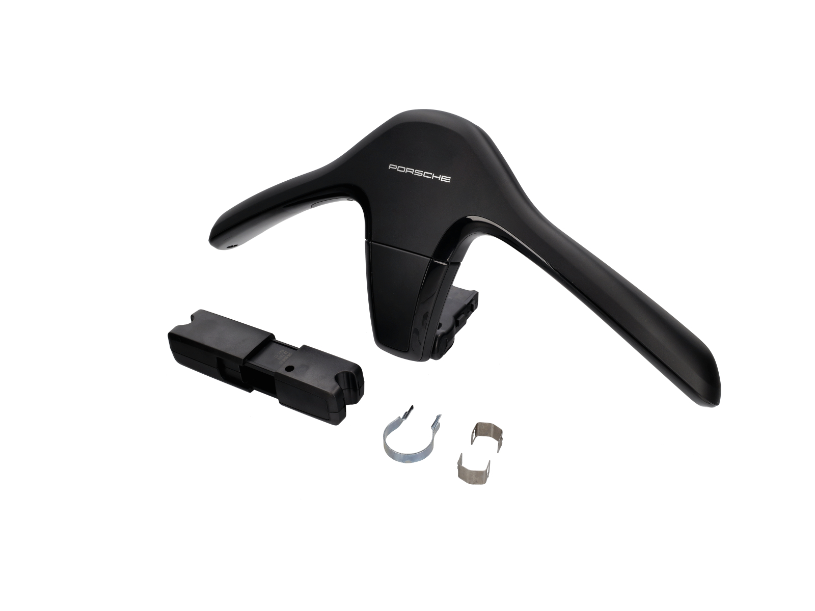 Everything inside a Porsche should stay in place, even during fast corners. That's why Porsche has enhanced the classic clothes hanger, making it into a system that fits like a glove when you're on the go and that ensures wrinkle-free transport. The modular design makes the elegant clothes hanger a practical companion at all times on your trip. After the base support with its practical click system has been securely attached, the hanger itself can still always be removed. A pull-out hook is integrated, ensuring that the clothes hanger system with its high-quality soft paint surface and Porsche logo in Silver also looks great in the wardrobe. This stylish transport solution is available for all Porsche Macan and Cayenne models with removable headrests.