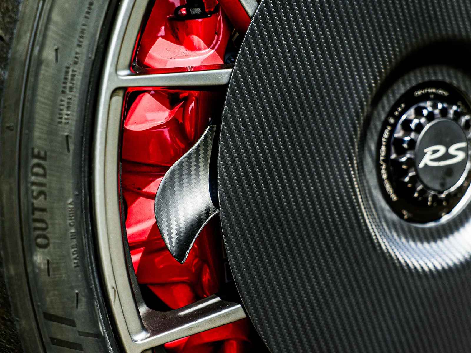 The DRS-1 rear spoiler features a more aggressive streamlined design with screw-less dry carbon fiber endplates, elevating its aesthetic appeal for the GT4 RS street car.