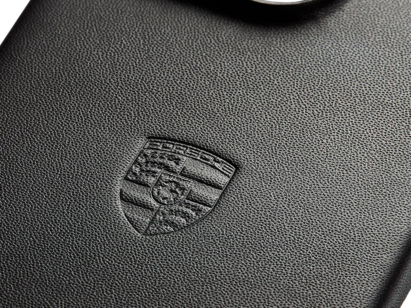 Stylish Porsche iPhone case in a modern, timeless design for the iPhone 16 Pro. The embossed Porsche Crest and '911' lettering on the 100% cowhide leather surface gives the mobile phone case its unmistakable look.
